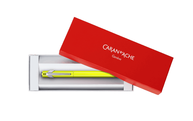 There is a new addition to the famous assortment of sleek 849™ ballpoint pens – the 849™ Fountain Pen boasting a bright style. With its more rounded lines, the 849™ Fountain Pen reveals a unique personality and comfort. The eye-catching, energising colours draw attention to the light yet robust aluminium body of the 849™ Fountain Pen.Four fluo colours give the graphic lines an extra spark. The matt navy blue and black enhances the contemporary design and industrial aesthetics of these writing instruments. The varnished white brings an element of balance to this refreshing whirlwind of fun. While maintaining a 100% Swiss Made quality, the 849™ Fountain Pen underlines the bold, creative spirit of Caran d’Ache.