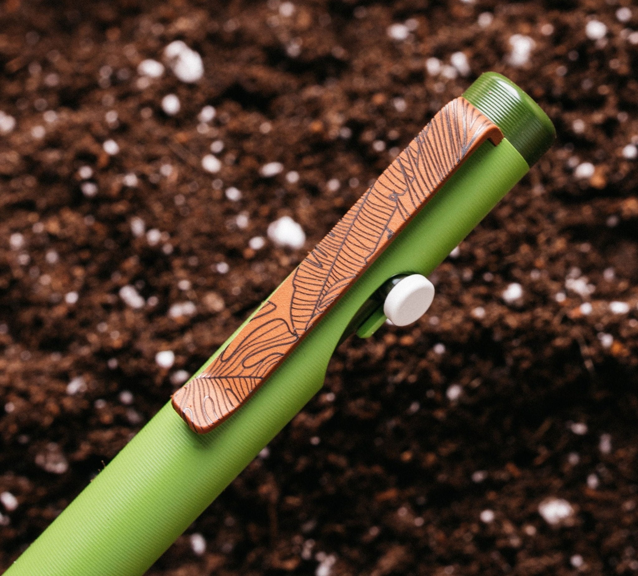 Chlorophyll, photosynthesis, xylem, and phloem. While not all of us are born with green thumbs it doesn't take a botanist to appreciate the beauty of plant life. Inspired by the humble houseplant providing freshness and greenery in unnatural, modern environments, Sprout borrows design elements from the Plantae kingdom – adding a welcome pop of color to your desk, pocket, or backpack with no water or sunlight required. Available for the first time on all Side Clicks, Bolt Actions, Slim Side Clicks, and Slim Bolt Actions, the themed colorway consists of a two-tone, glossy green Cerakote body, with accents, and complex foliage laser engraving on a terracotta brown clip.