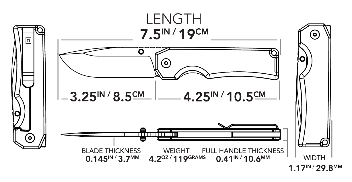 The Ti Pocket Knife II is a single screw scale design, frame lock folding knife. It features a M390 blade, grade 5 titanium scales and runs on ceramic ball bearings. The Inline flipper + dual thumb studs give it a clean look, smooth action, and easy deployment. It is durable, strong, and lightweight. With a true deep carry and reversible pocket clip, it makes the perfect EDC knife. Backed by a lifetime warranty and free shipping!