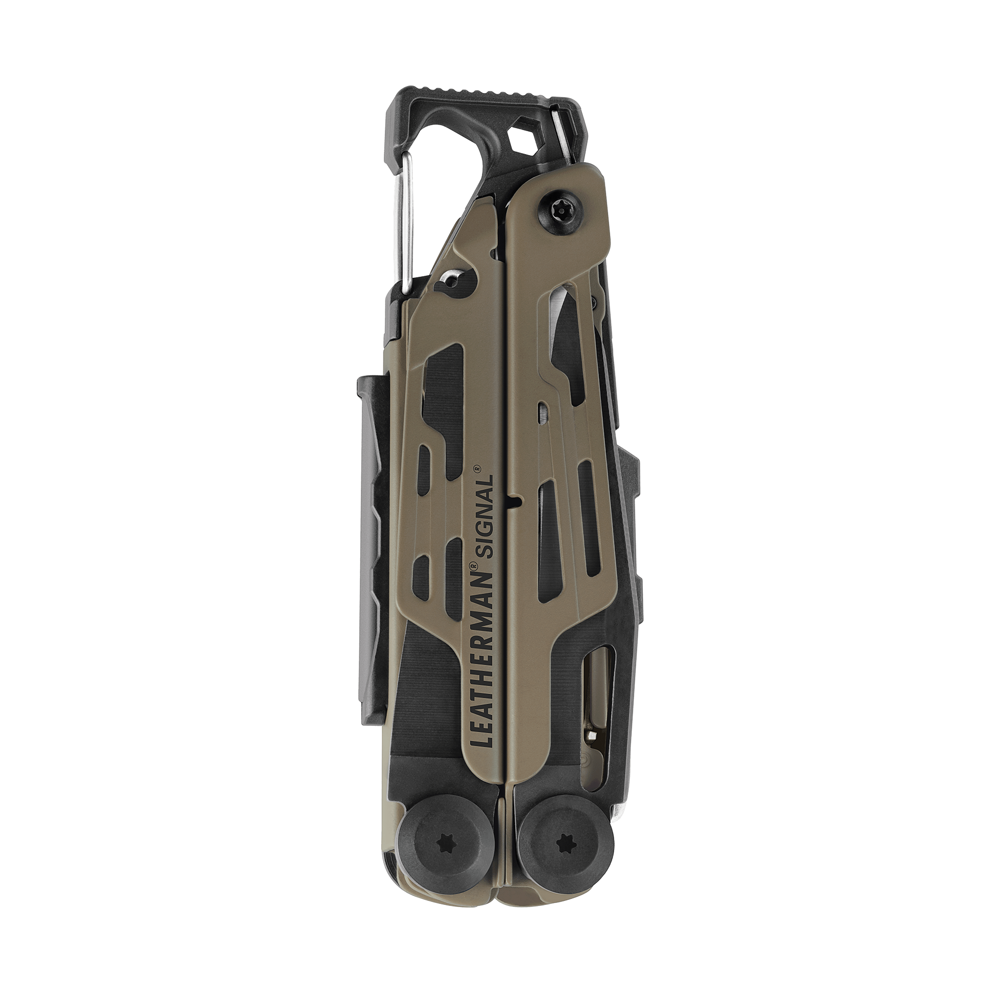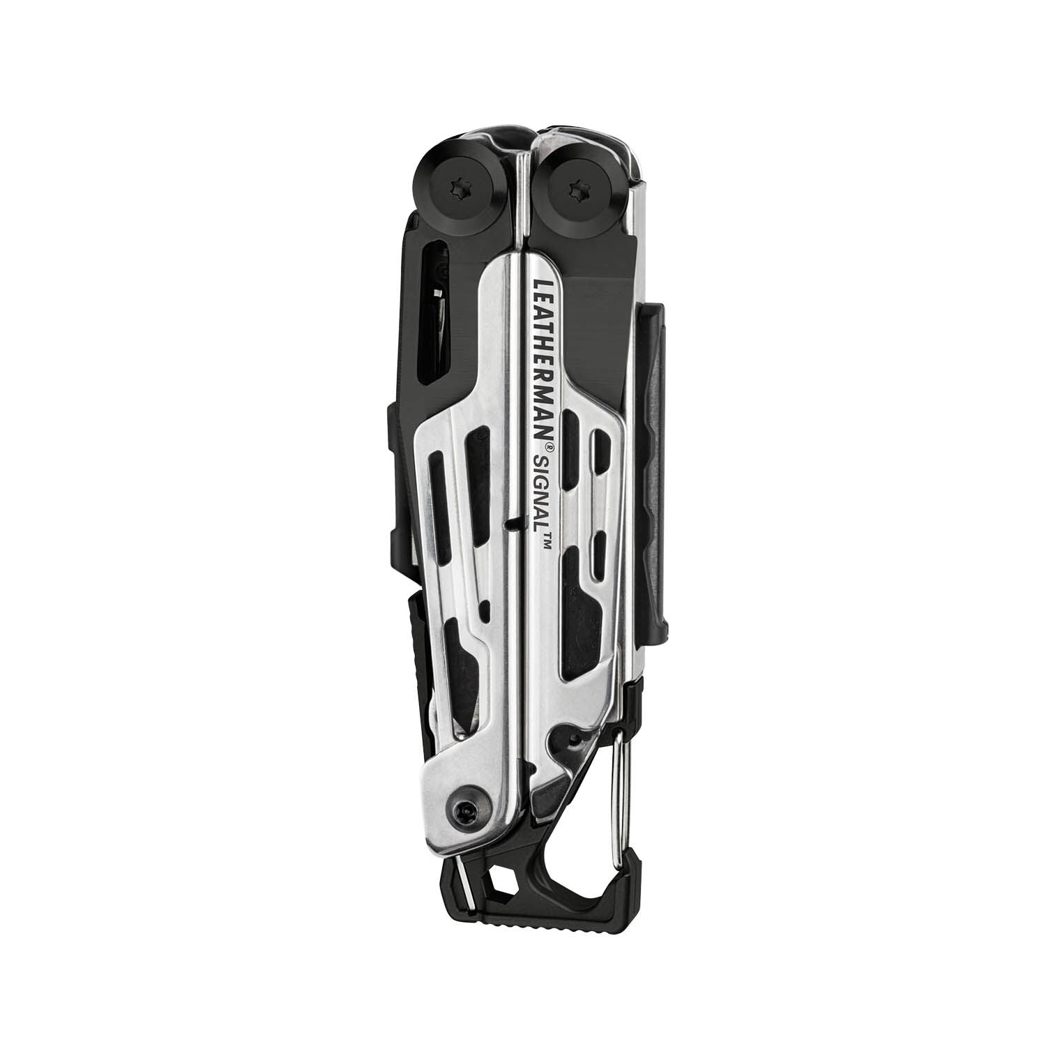 A perfect fit for any adventure, the Signal combines 19 useful tools into a compact, 4.5 inch size. This multi-tool readies you for the unexpected with its fire-starting ferro rod, 420HC combo blade, and emergency whistle. Tighten gear with the customizable bit driver and anchor your tent stakes with the built-in hammer. Gear up and go further with the Leatherman Signal. DLC coating on stainless steel and black. Cerakote® for coyote tan, aqua, crimson, grey, and cobalt colors. Nylon sheath included.