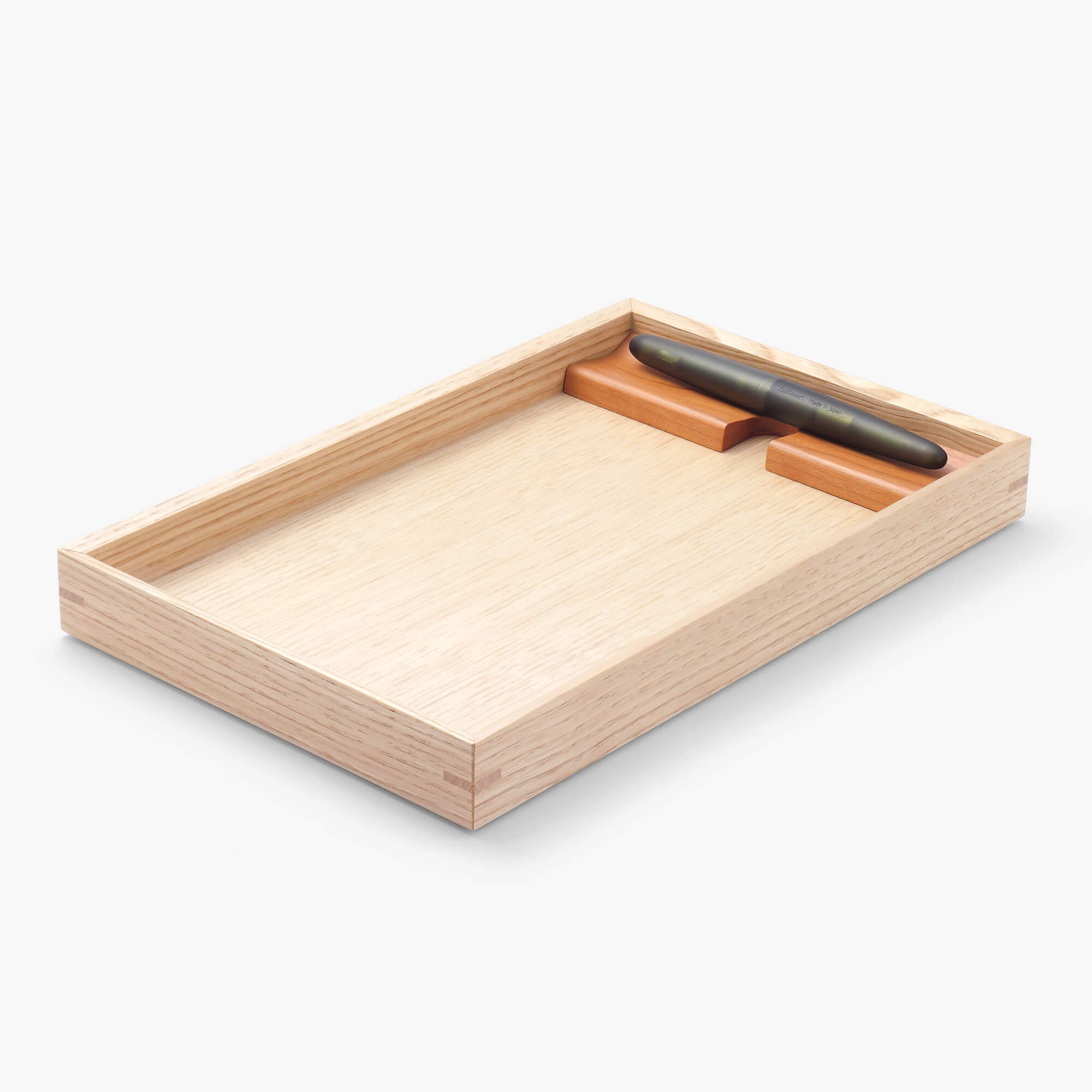 The pen tray is crafted from the reddish heartwood of Japanese cherry, selected to conceal marks and wear. Its soft, tactile form gently cradles your cherished pens and fountain pens. A recessed detail allows for easy removal of paper and cards with one hand.