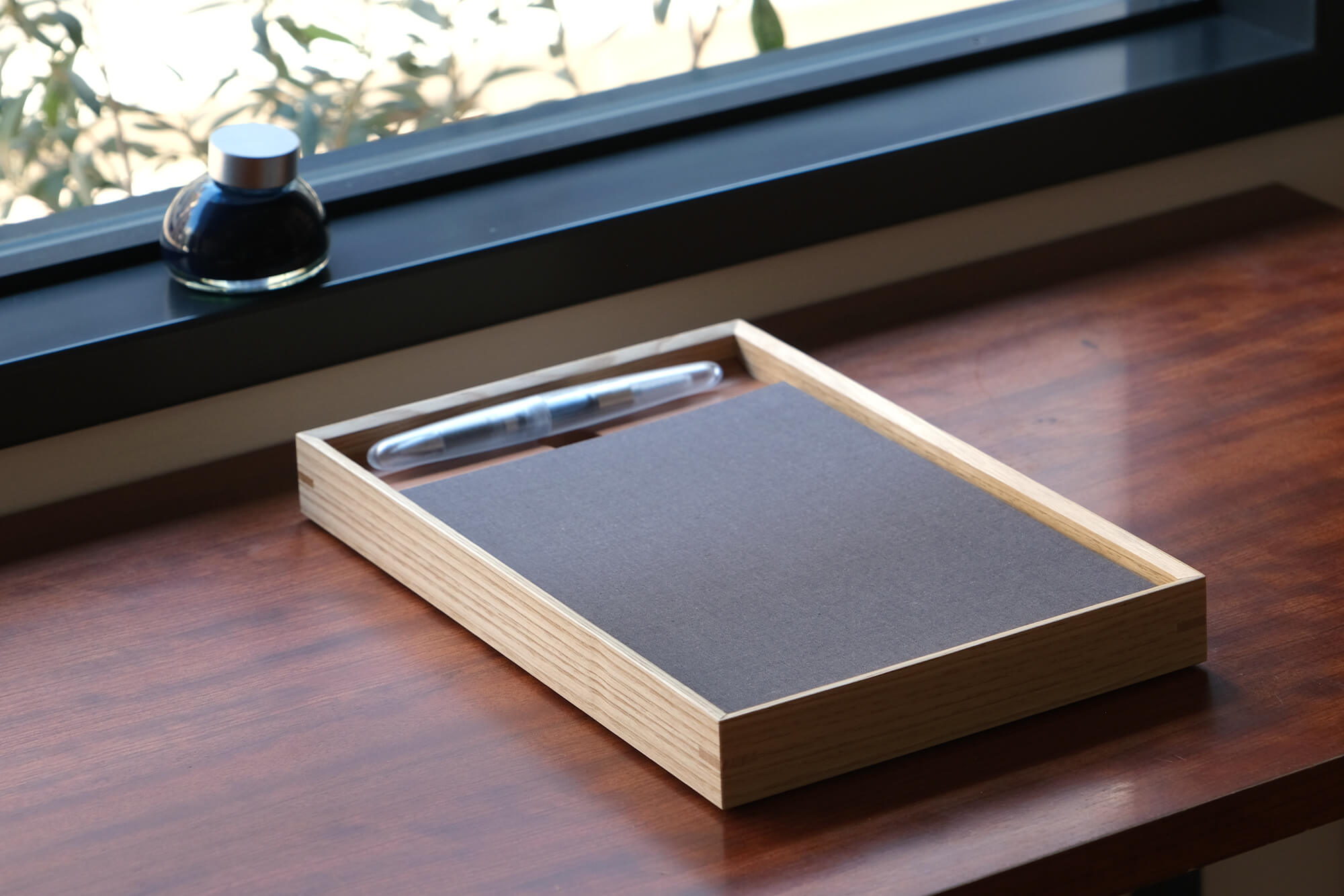 A stationery tray designed to hold one pen and A5-sized paper items — ideal for storing your favourite writing tool and paper goods. The natural two-tone finish, combining chestnut and Japanese cherry wood, blends effortlessly into any space.