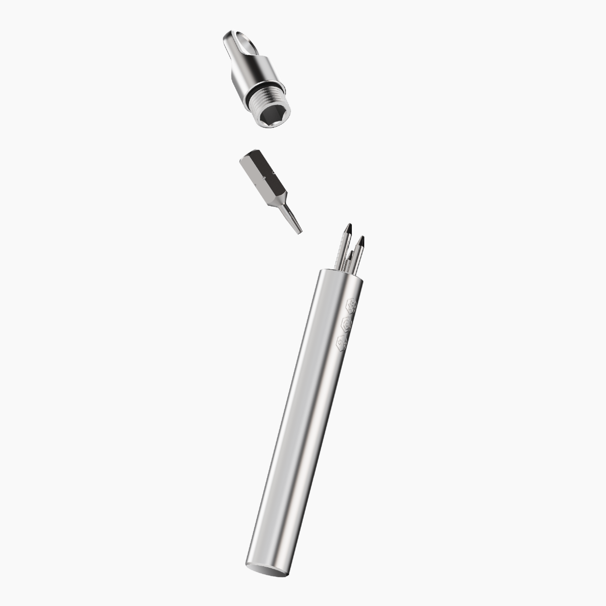 Integrated in the cap is a magnetic tool holder that includes a replaceable T6 hex bit (made by Wiha).