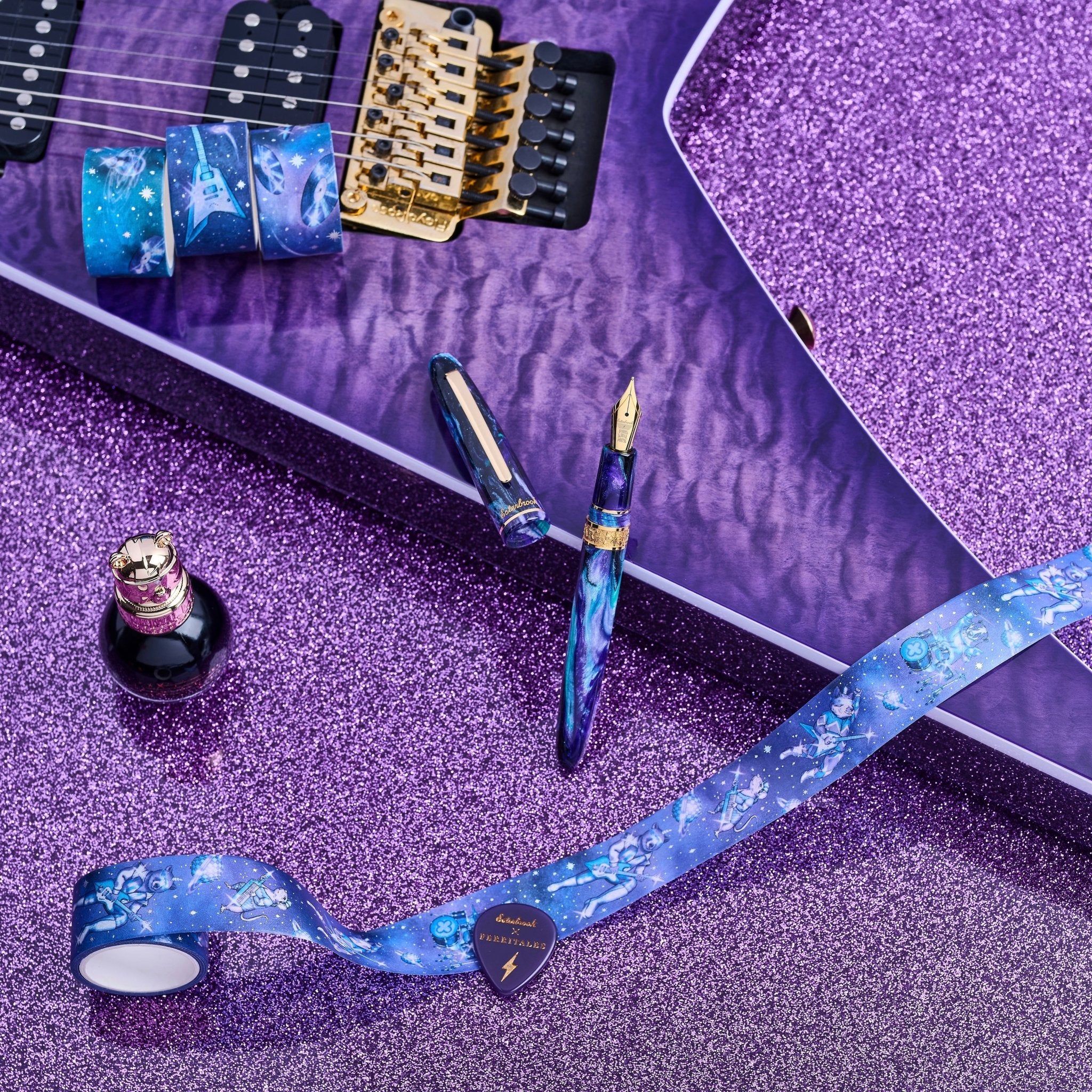Presented as a collector’s set, the Rockstar includes the fountain pen, a custom Ferris Wheel Press ink bottle with their signature bear cap, and a themed guitar pick, bringing the collaboration together in one complete writing experience.