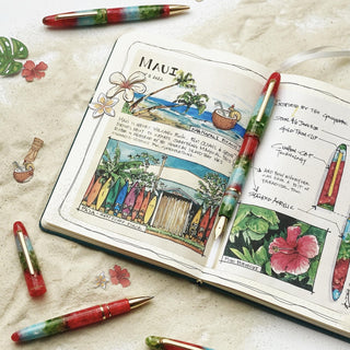 The Maui Estie will be a Limited Edition line from Esterbrook, available in regular and oversized. This Estie is fitted with gold trim and will come in standard #6 Jowo sizes (EF to Stub), including nibs from our custom nib program. It is also available in rollerball and ballpoint.