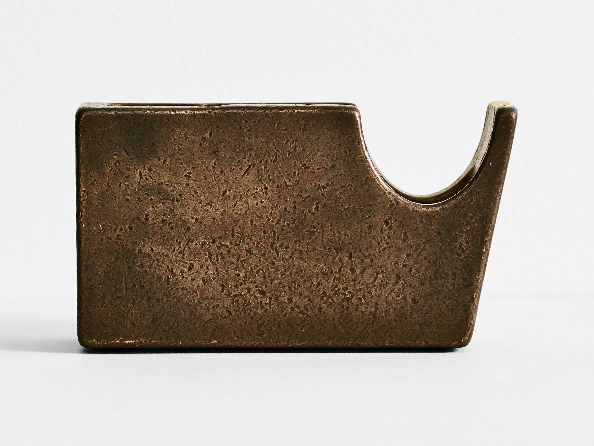 The Bronze Tape Dispenser is a hefty piece of stationery. It is cast in solid gunmetal bronze with machined teeth. Fits standard scotch tape rolls. It is rumble finished for a smooth surface texture and has also been heat treated.