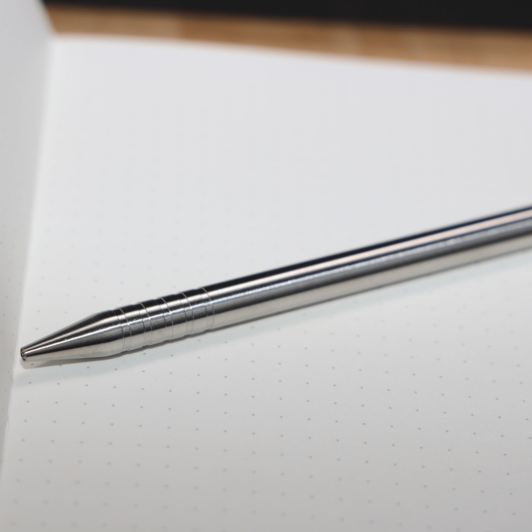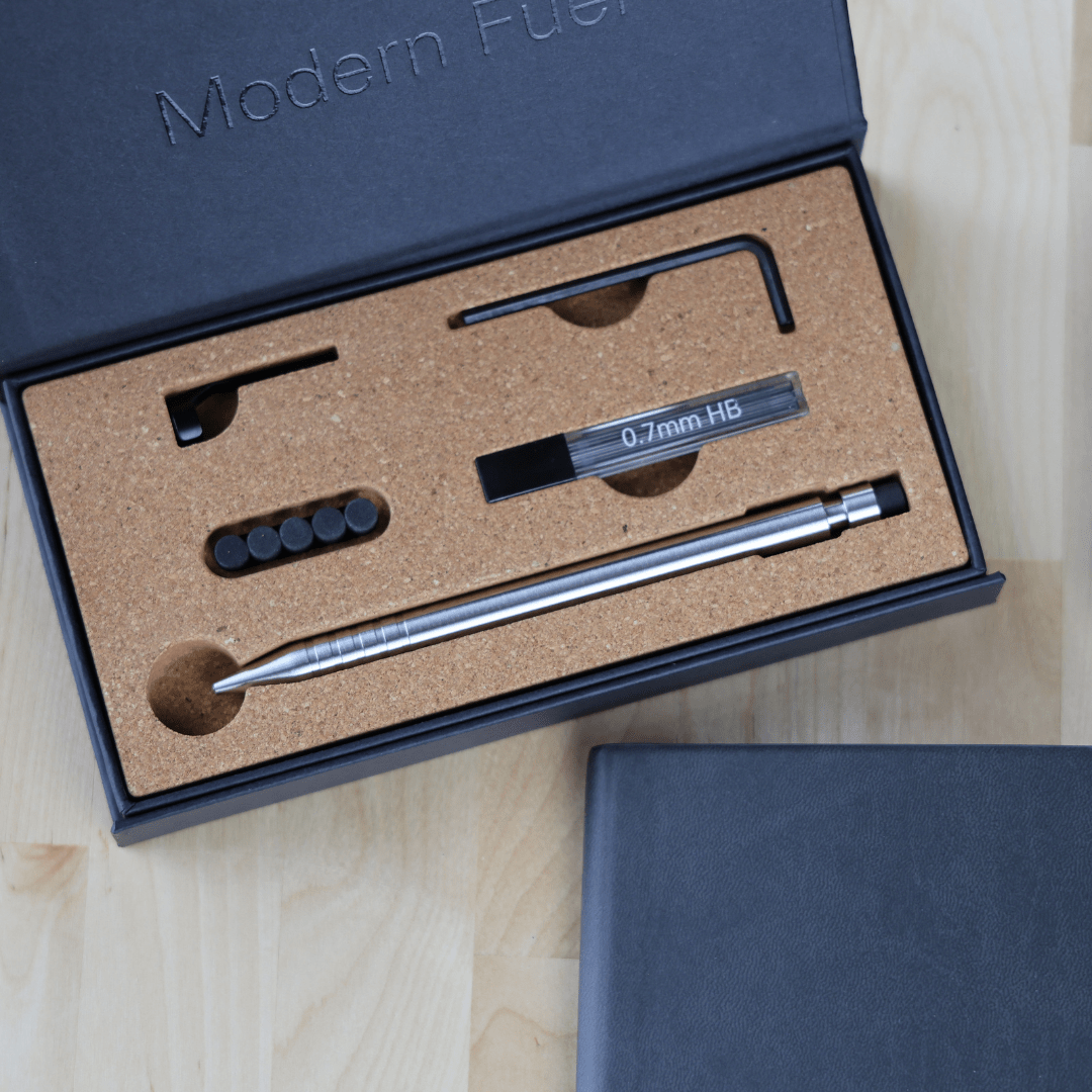 Every Modern Fuel pencil is carved out of a solid block of metal and contains no plastic parts. The pencil is an engineering marvel that fits together seamlessly. No two pencils are exactly alike, the cone and body are mated together during production for a flawless presentation.