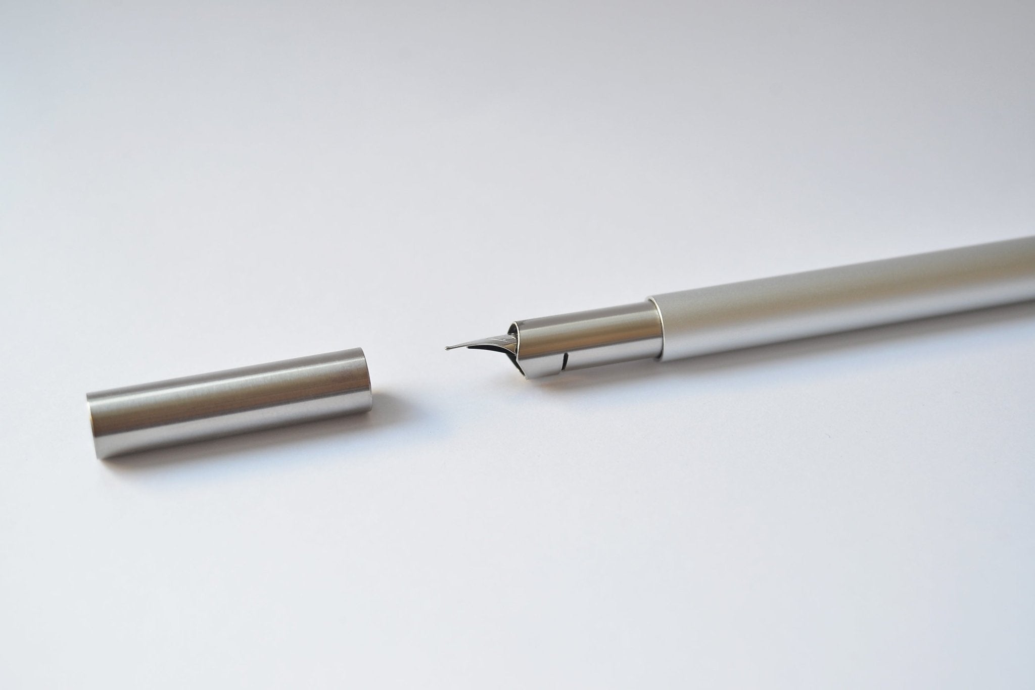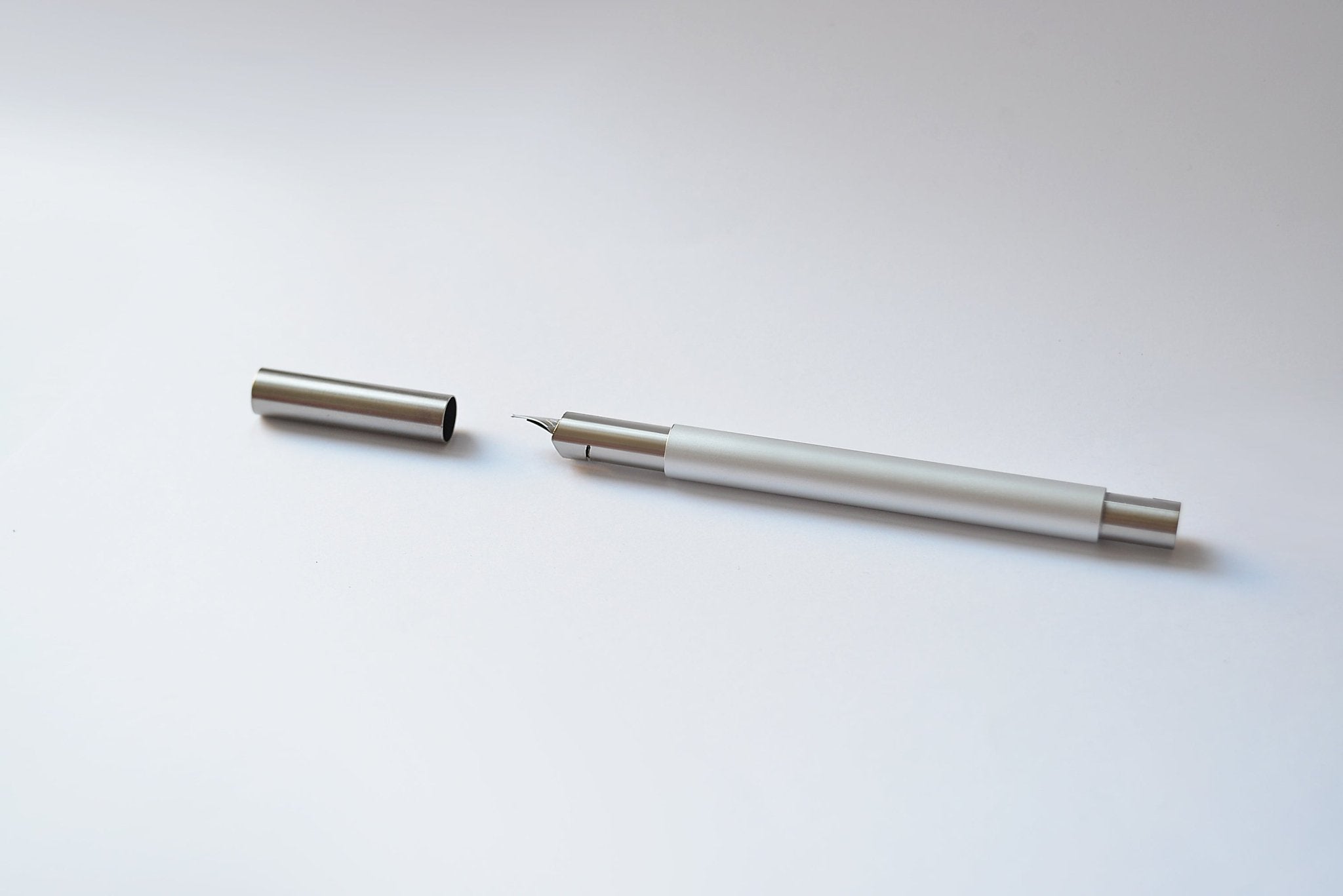 The 7000 aluminum is a cartridge/converter fountain pen with a minimalist approach and a strong focus on blending different materials and textures. While most of its construction is in stainless steel, the body is made in anodzed aluminum. Cap, section & body are push-pull to open/close. It utilizes international short/long cartridges or compatible ink converters (one included).