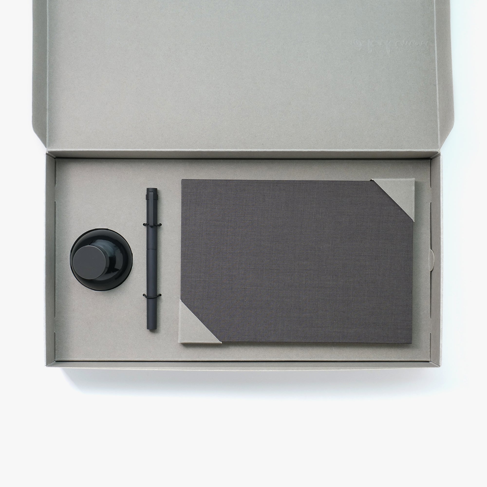 Cherish the time alone with your thoughts. A gift of introspection with a notebook and pen for company. The classic pairing of black and grey caters to all tastes, while the sturdy hardcover will be at home among your treasured book collection. For keeping words that stand the test of time.