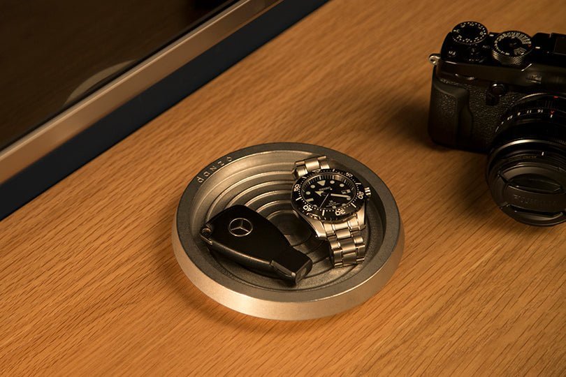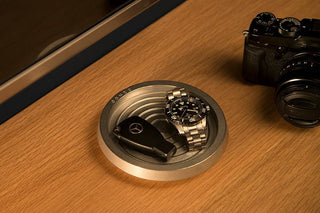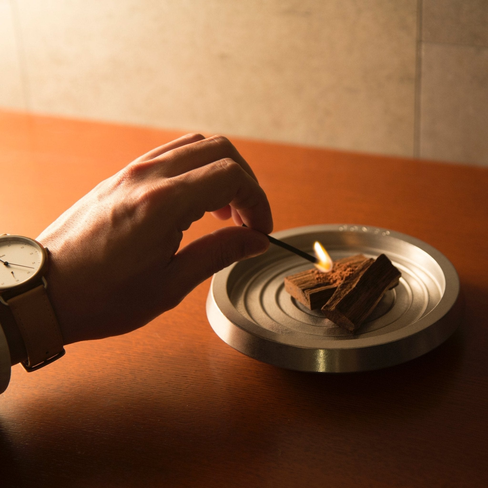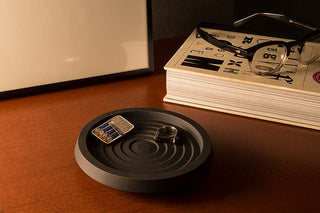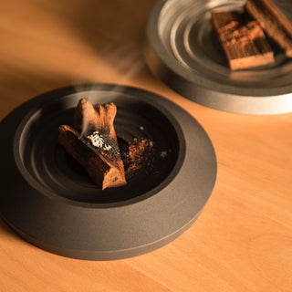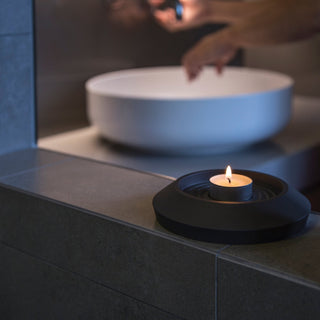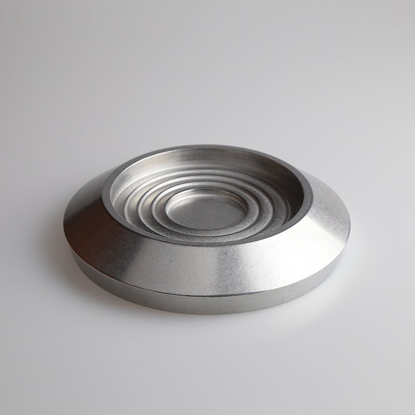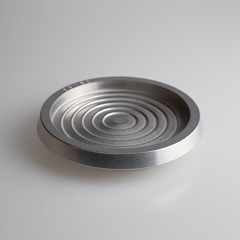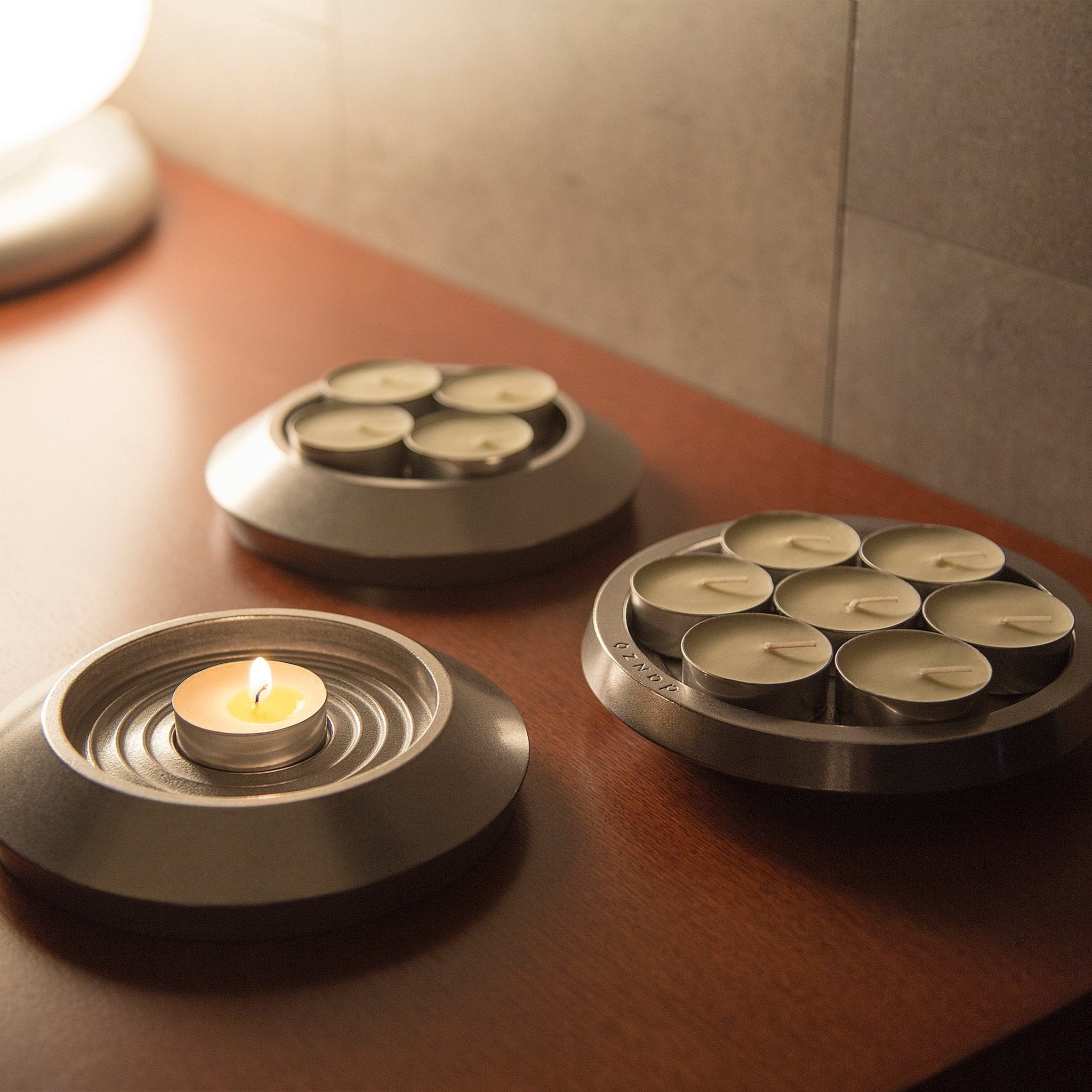 Tea light 147 is inspired by a simple idea of making the luminous intensity of candlelight literally dimmable. The reversible dish-shaped holder, with concentric rings engraved on the bottoms, presents three positioning choices for tea lights in the numbers of 1, 4 or 7; also works as a steady plate for larger candles in different sizes.