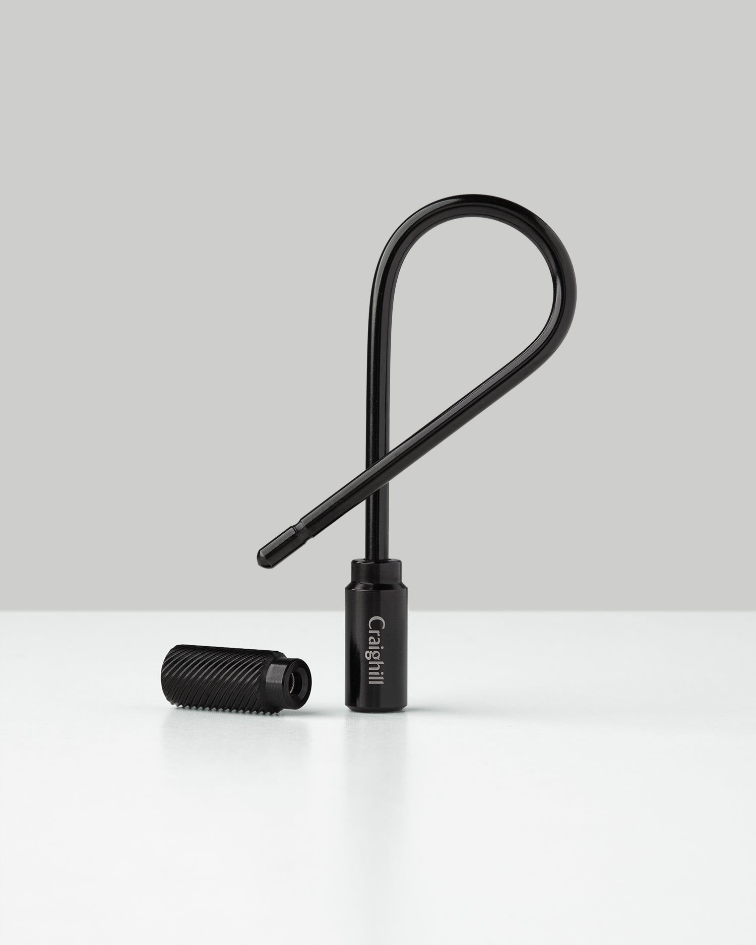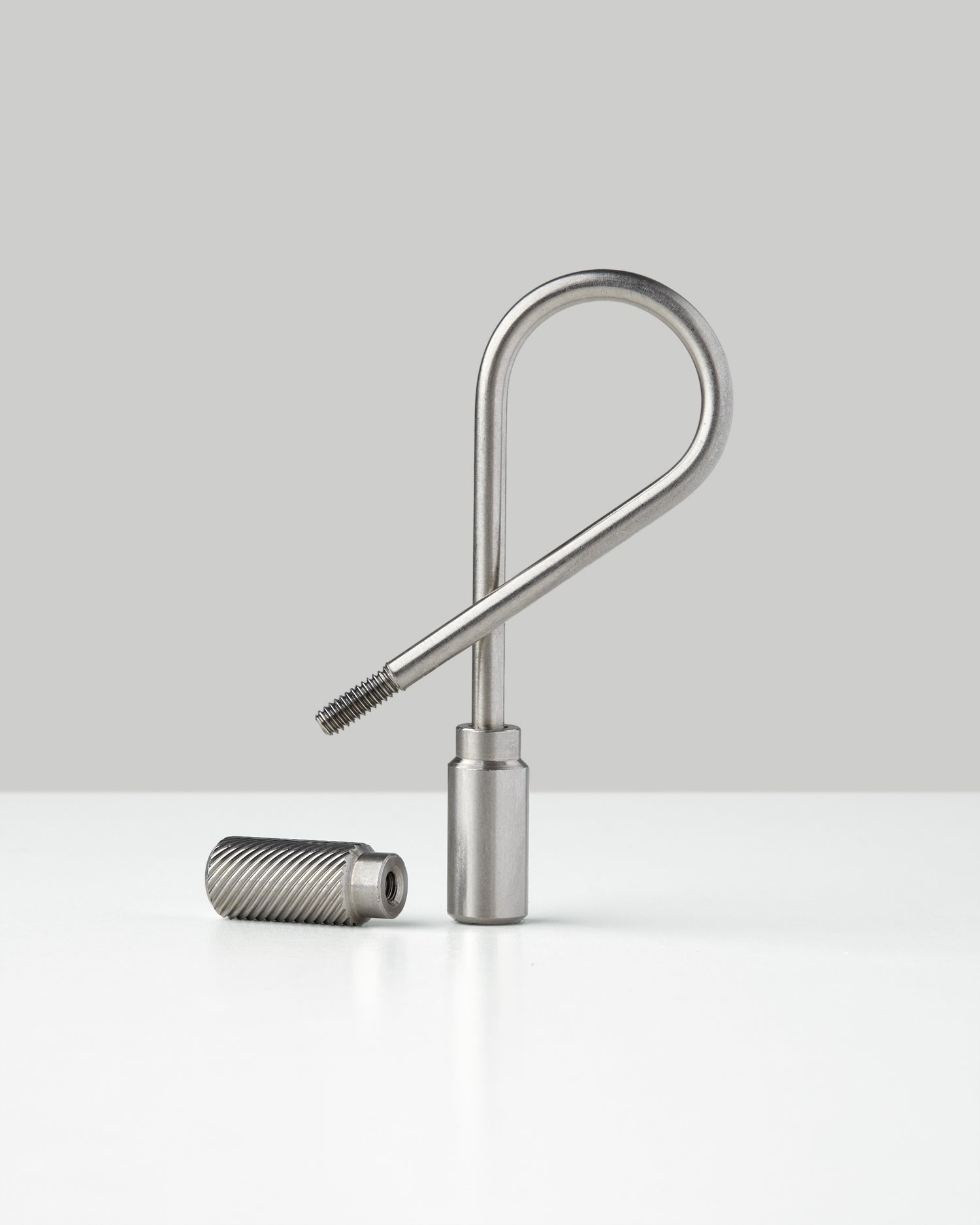 A helix-shaped wire with turned end-caps. Simply unscrew the knurled side to add or remove keys.