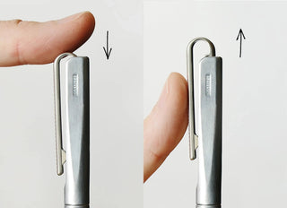The clip is also the button that exposes the tip of the ballpoint. Pushing on the top exposes the pen tip, while pressing on the front retracts it.