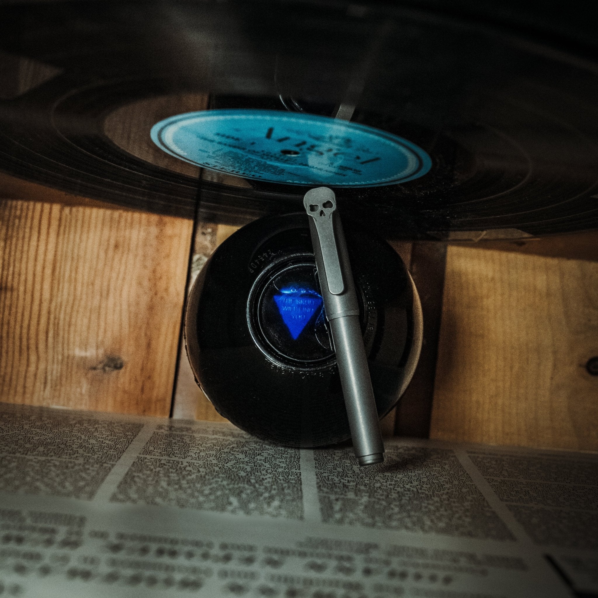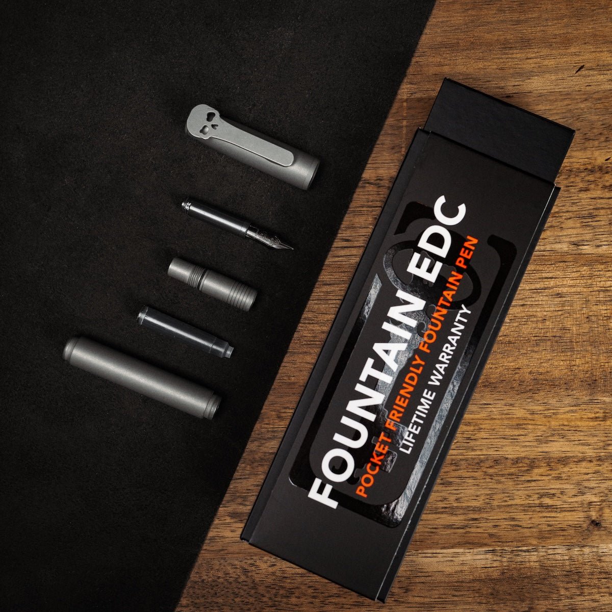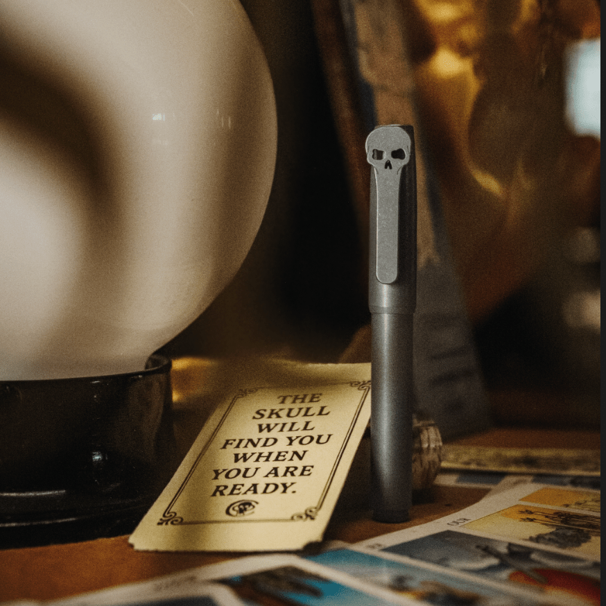If you are into knives, you can spot his iconic skull pocket clip from across the room. Our timeless design languages feel like they were destined to be together. This grade 5 titanium pen is comfortable, pocket-friendly, and writes extremely well thanks to the premium, blacked out, German made Bock 180 Extra Fine nib.