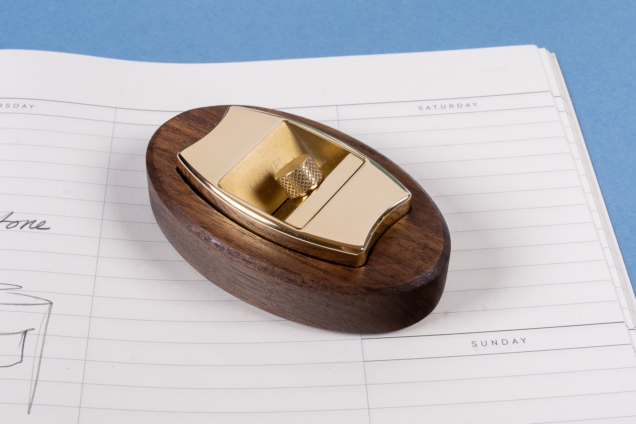 The base functions as a chamber for shavings as you sharpen and looks great on any desk. Both walnut and cork bases make the perfect companion to your Høvel.