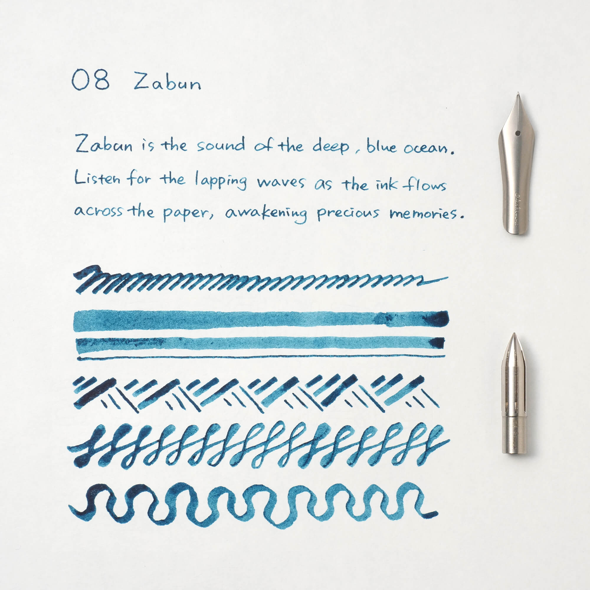 "Zabun is the sound of the deep, blue ocean. Listen for the lapping waves as the ink flows across the paper, awakening precious memories." Our original inks are inspired by Japanese word play and imagery. Listen to the colourful conversations of dripping ink.