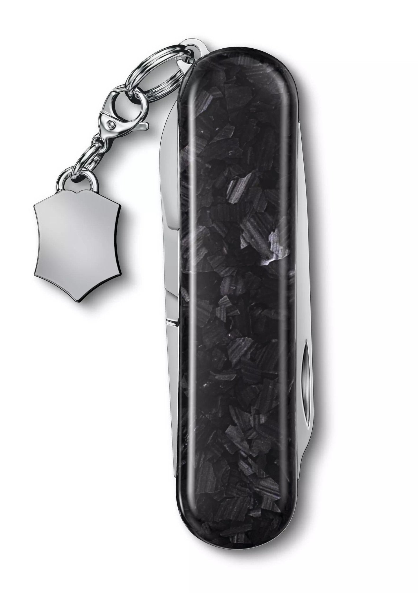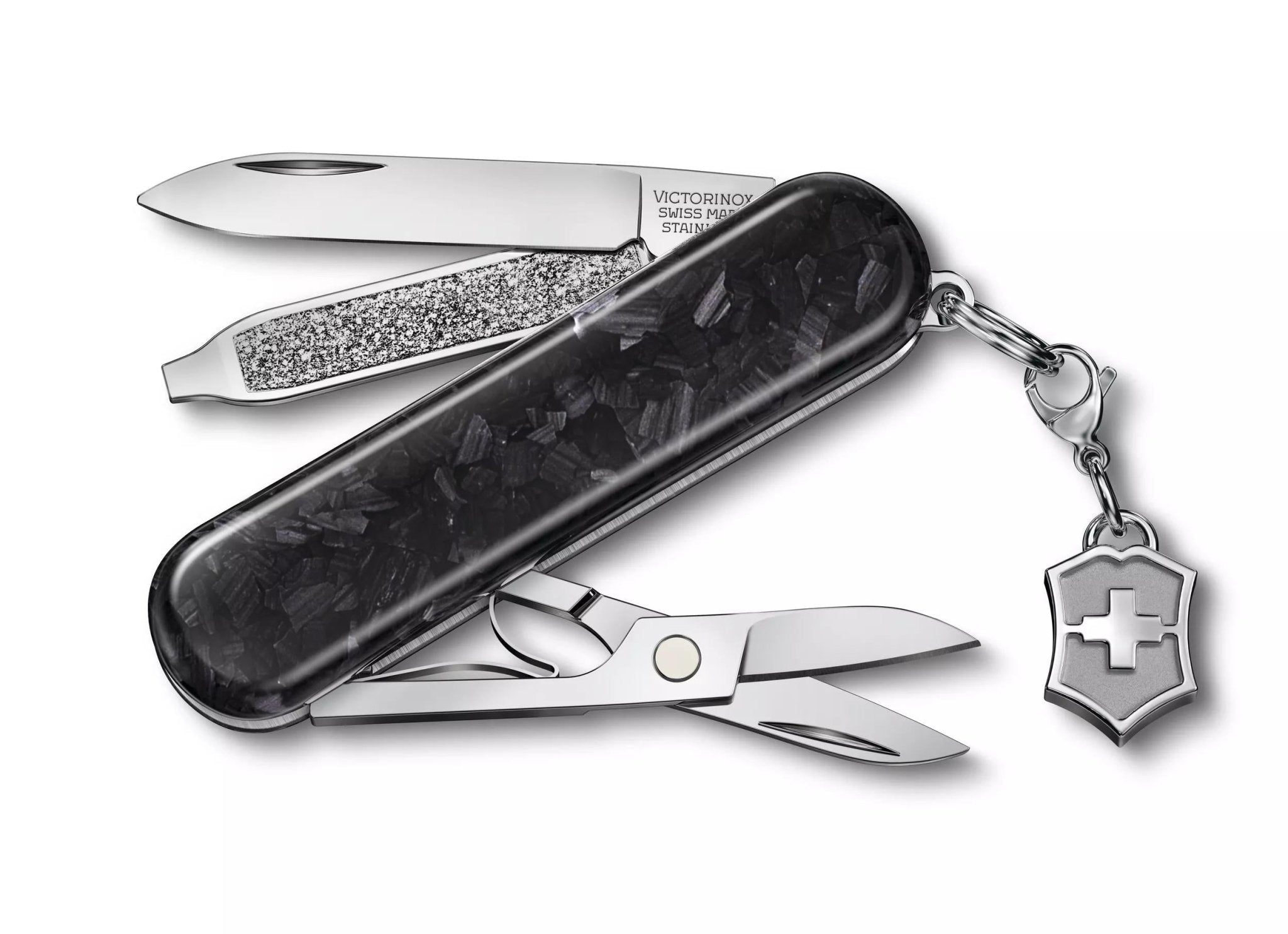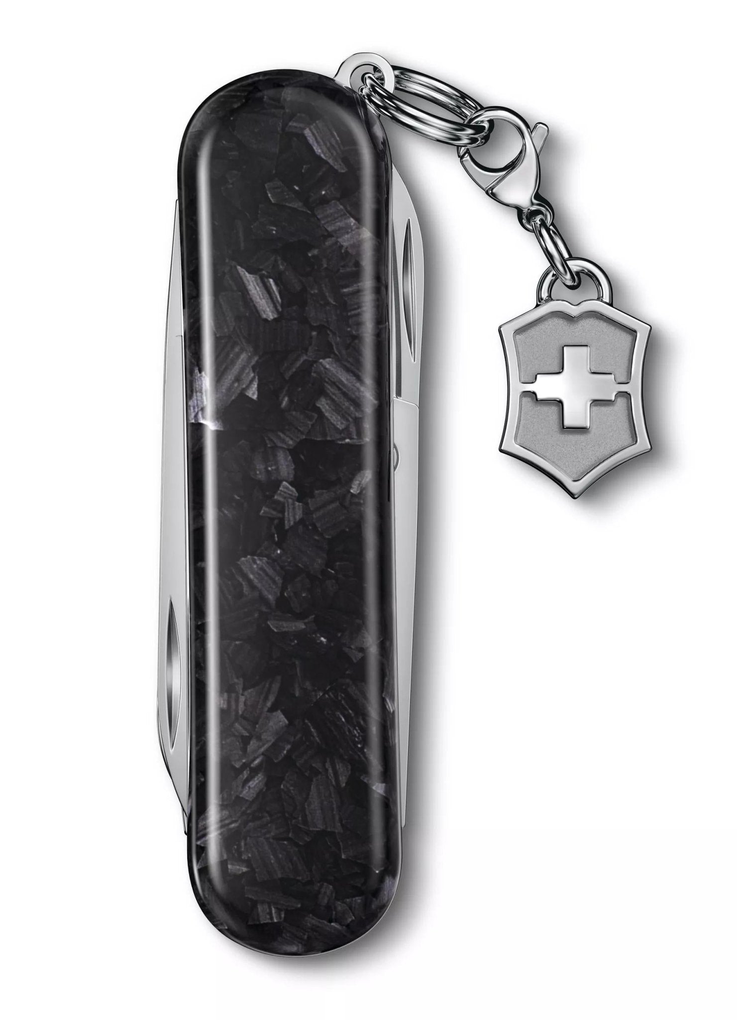 With its compact silhouette and high-tech aesthetic, this pocket knife embodies modern elegance. The Classic SD Brilliant Carbon is crafted from lightweight yet durable carbon fiber made from organic polymers, giving it strength without bulk. A matching cross and shield charm adds iconic Victorinox style. Embrace the future of indispensable multi-tools.