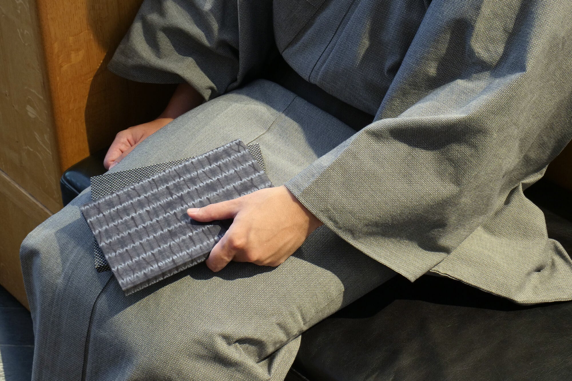 The kimono fabric is made in Katakai town in Ojiya, Niigata prefecture. The fabric is stitched with cotton thread and gathered before being dyed, resulting in a distinct striped pattern. The design is not only pleasing to the eye but exquisite to the touch.