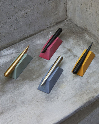A perfect resting place for your favorite office cutting tool. The Desk Knife Plinth consists of a pyramidal base, individually cast in pigmented concrete, with a void that secures the knife along its center of mass.
