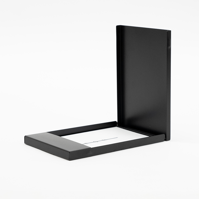 The Metal Case by Japanese design studio 'FOR' is made of titanium and fits ruffly 20± cards. This model is part of the 'Black Series'. Very light case to store your business cards.