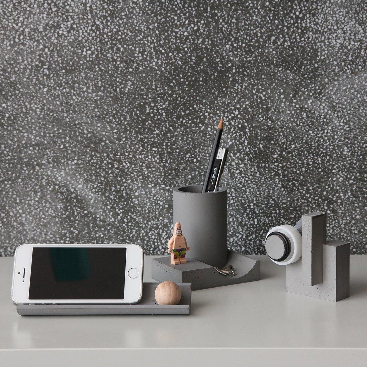 While Tape Dispenser serves as a useful piece of stationery, its design also thoughtfully employs three basic geometric shapes giving it its sculptural qualities. A large hexahedron serves as the weighted base, a slender rectangular prism holds the cutting blade and a cylinder acts as the tape holder.