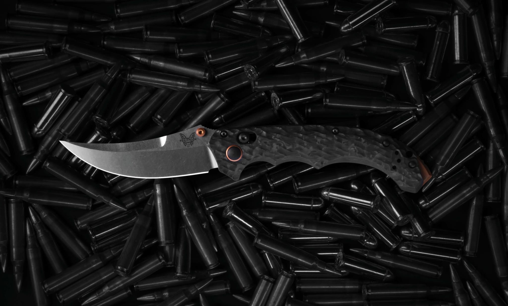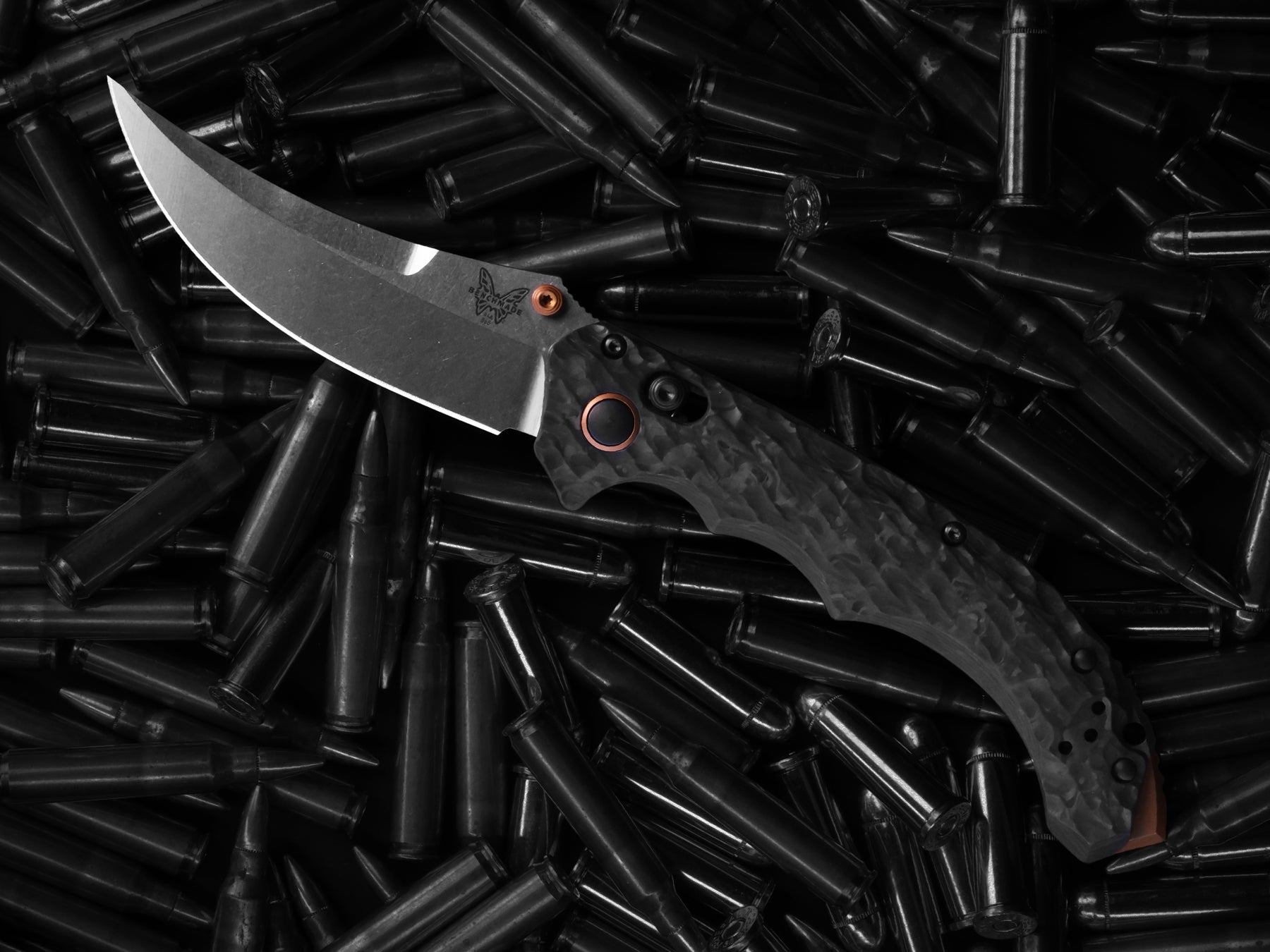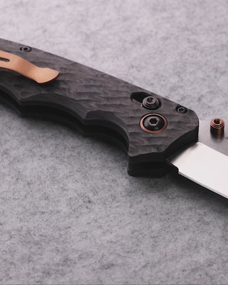 Tactical ferocity meets stylized refinement with a new EDC-friendly size in the wicked 865-02 Mini Bedlam®. Decked out in premium materials and finishes, the CPM-S90V super stainless steel blade with a satin finish gets to the point with an upswept scimitar shape ideal for hooking and slicing. The handle is crafted with marbled carbon fiber and features aggressive textures that flow with the curvature of the handle for a superior grip through quick movements and bigger cutting tasks. The 865-02 Mini Bedlam® is finished with black oxide and dark copper PVD hardware and a chamfered copper PVD backspacer to complete its unpredictable reptilian vibe.
