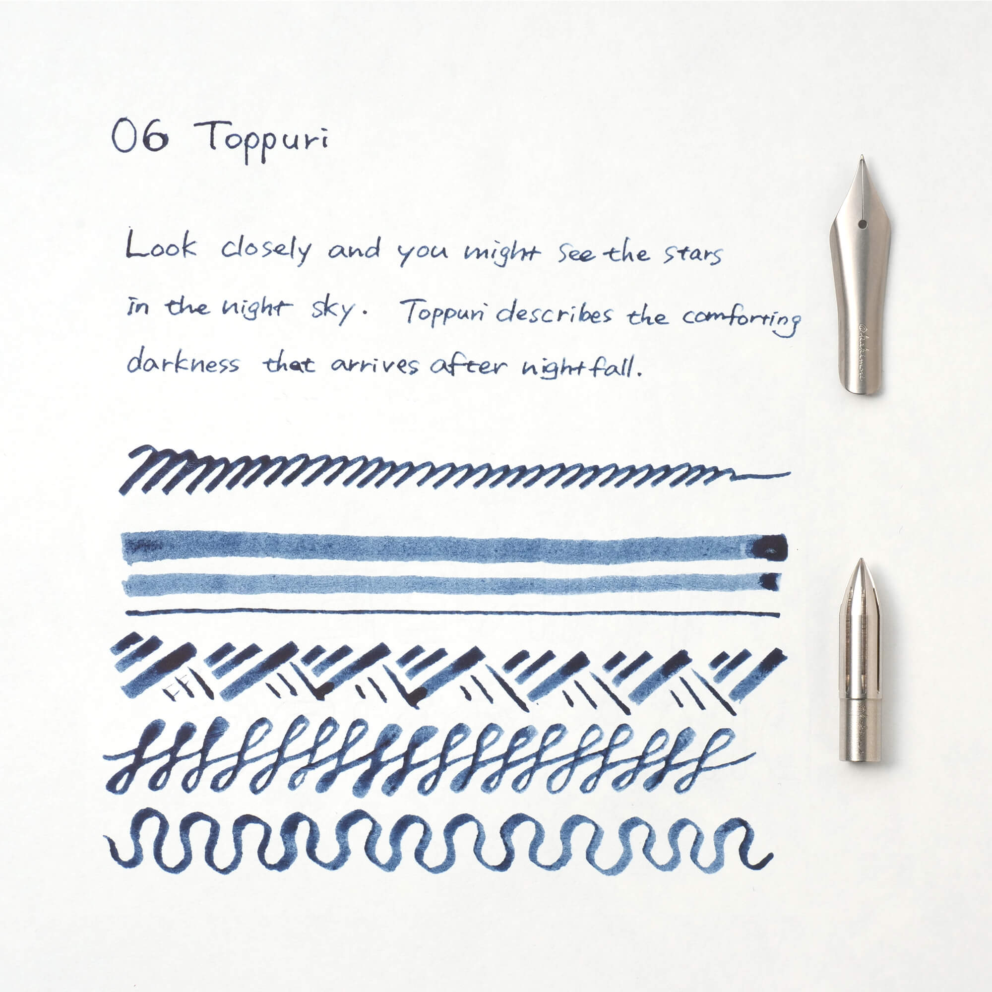 "Look closely and you might see the stars in the night sky. Toppuri describes the comforting darkness that arrives after nightfall. A gentle colour that inspires reflection." Our original inks are inspired by Japanese word play and imagery. Listen to the colourful conversations of dripping ink.