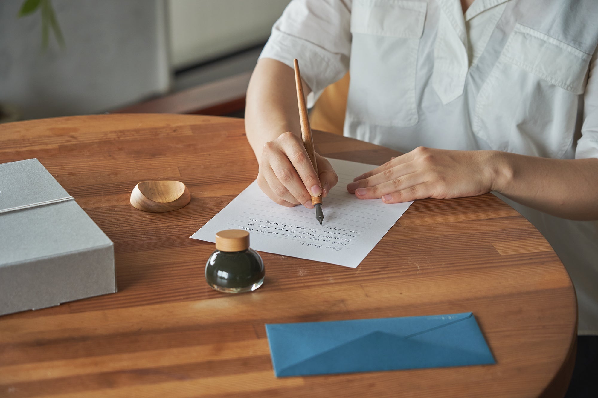 Write and unwind. A gift of unhurried moments with a pen in hand — let the natural warmth of Japanese cherry ease you into calm. The dip pen set includes pigment ink in Mukuri, the shade of the nurturing red earth.
