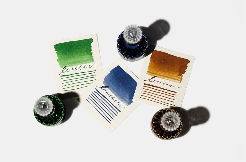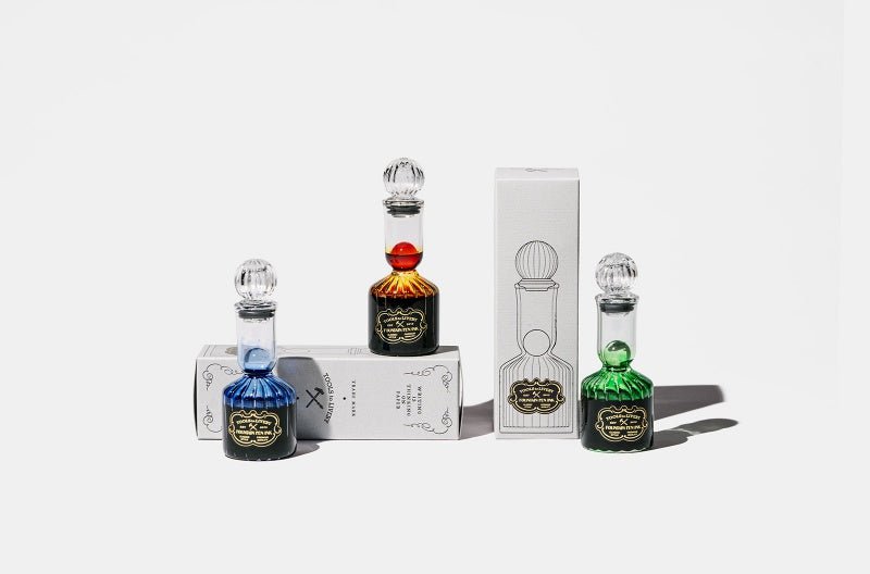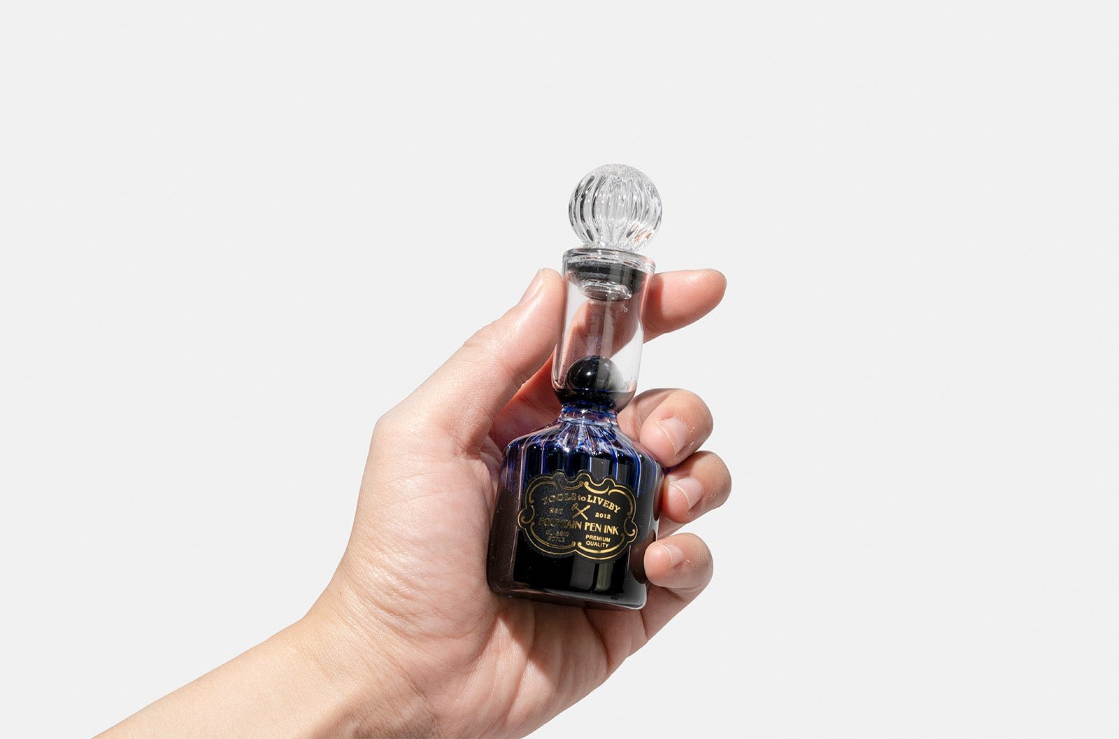 Handmade by a Taiwanese master, the glass bottle is designed to emulate vintage French elegance. The round bottle cap has a great feel and grip, making it easy to open the bottle. The special glass tube design in the center effectively adjusts the ink output, suitable for both fountain pens and brush pens. The design of the inner layer of the bottle reveals beautiful ink marks when used.