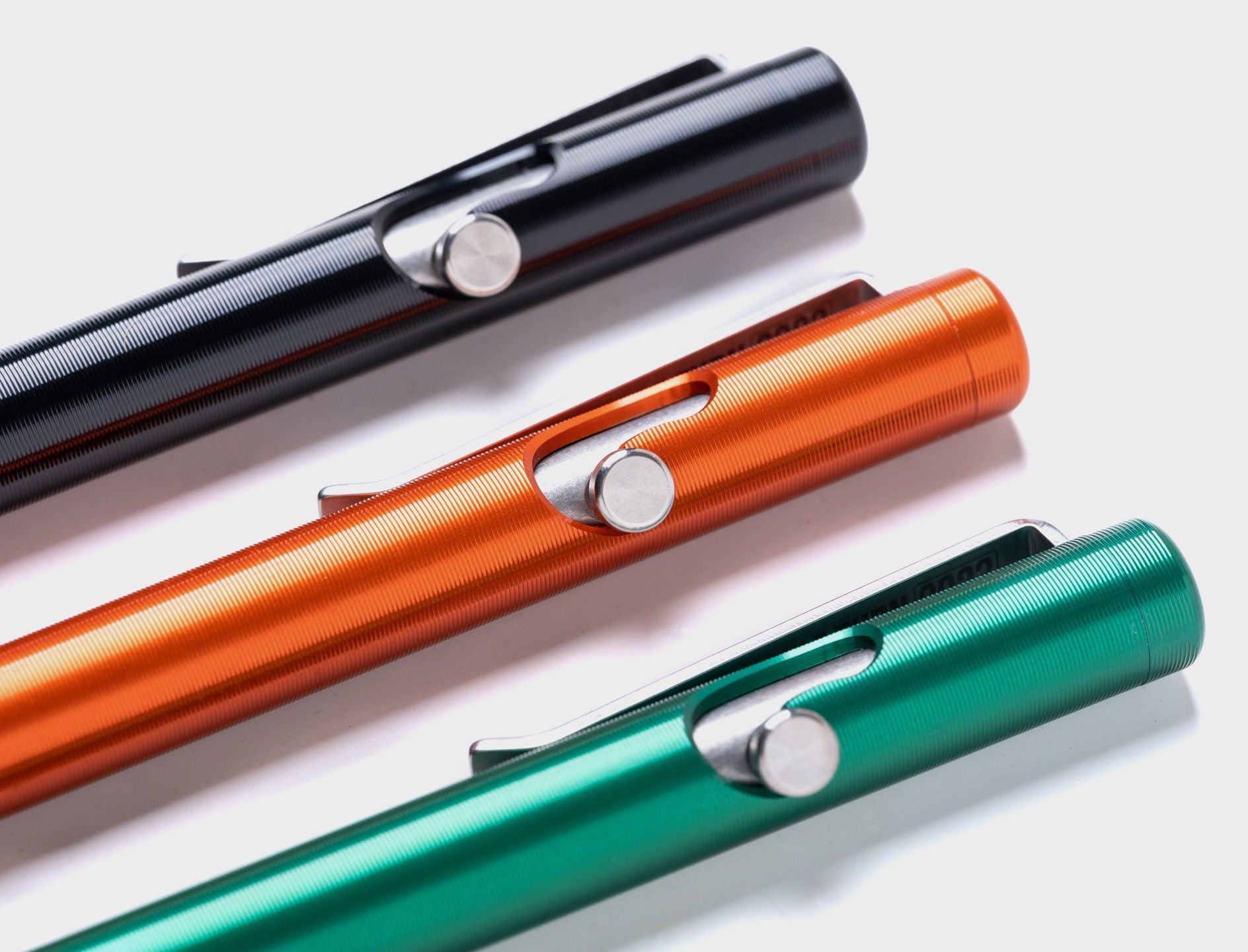 We used to offer anodized aluminum pens back in the Slider and Glider days so, when a designer asked about doing a custom run for his brand, we jumped at the opportunity to get some color samples made and they turned out amazing. Aluminum anodizes beautifully, machines quickly with minimal wear on the tooling, and is less expensive than any other material we offer. No telling if we'll keep doing runs or how long they'll be in stock but, if you want to add a cost-effective pop of color to your collection, look no further.Material