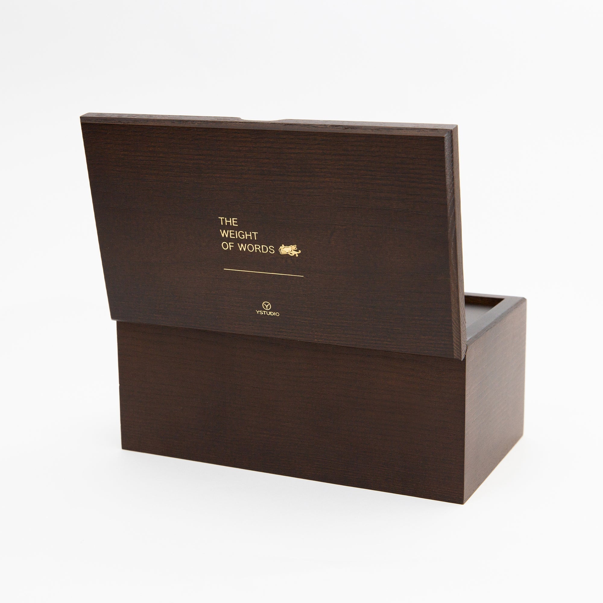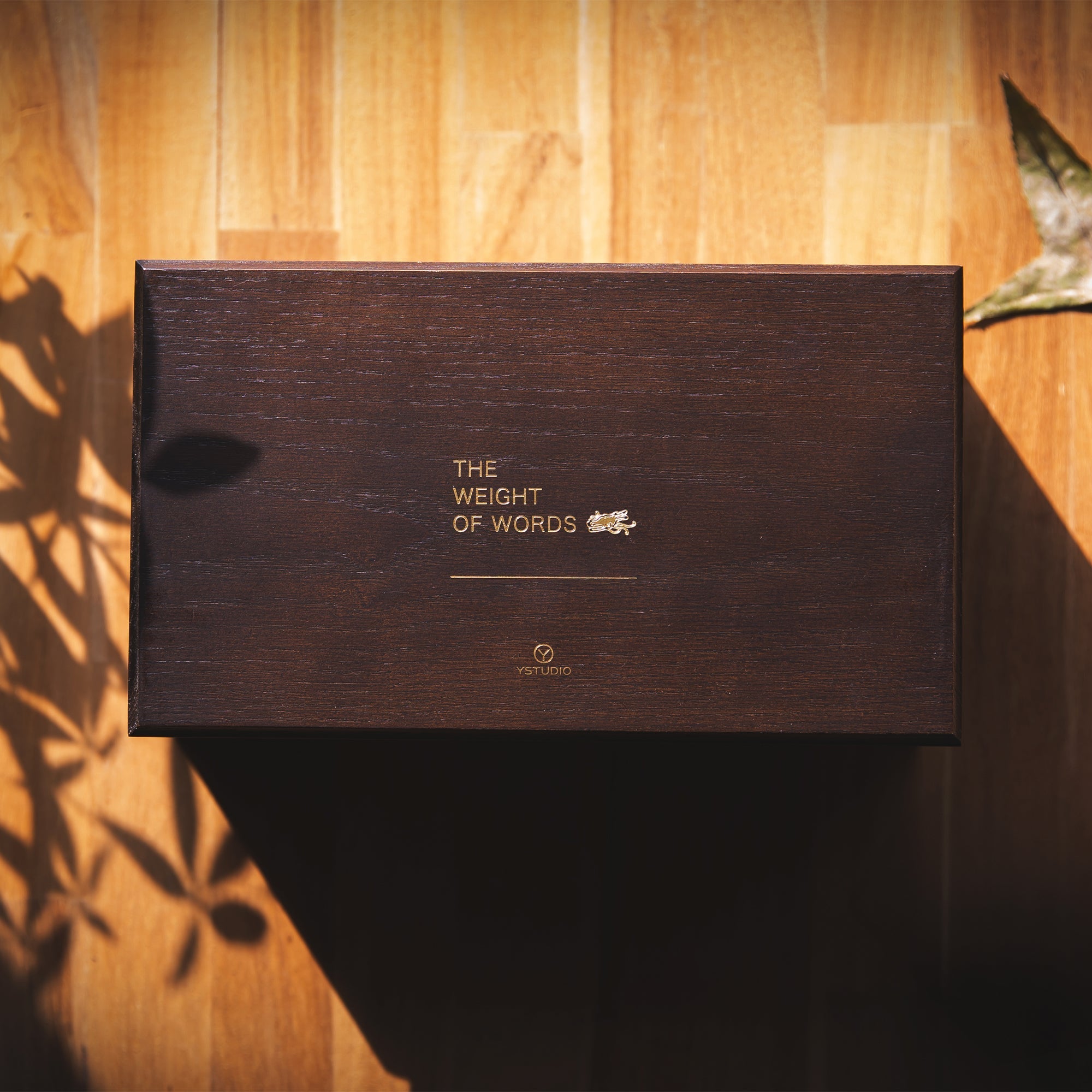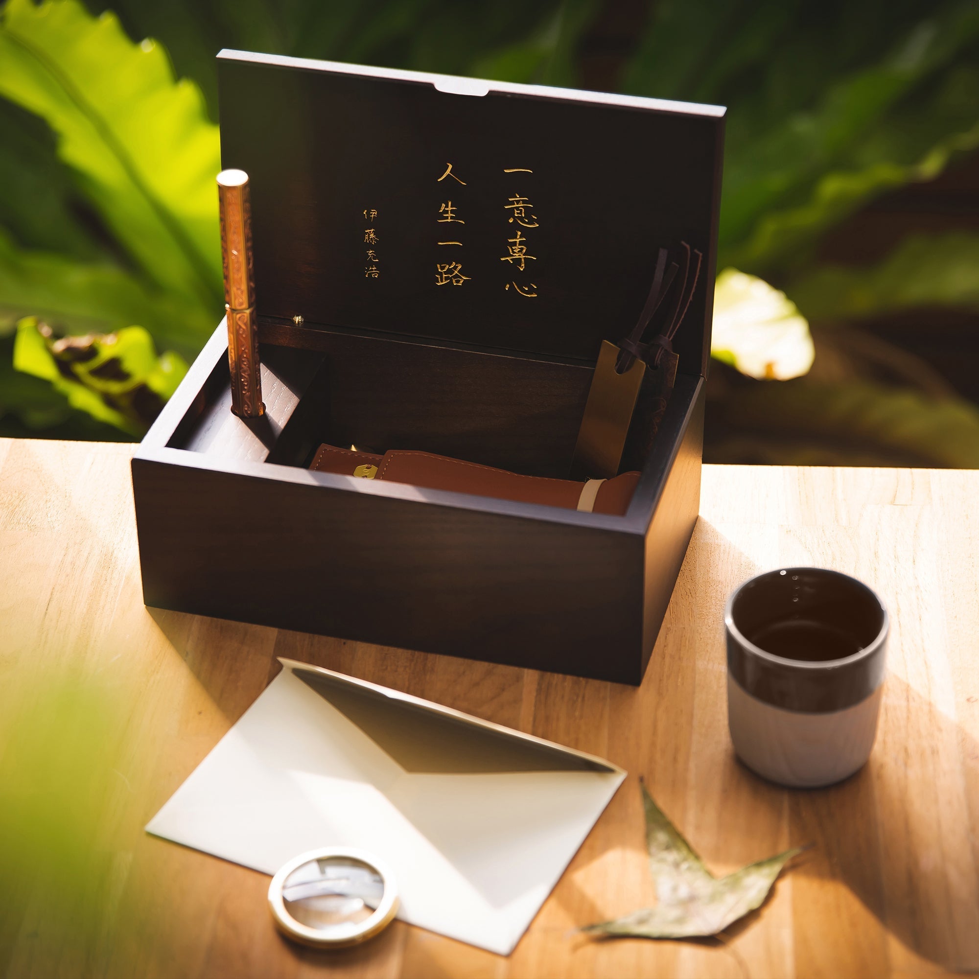 Crafted from solid wood, the dragon-patterned goldware display box offering sturdy and ample storage space. Designed with a special pen holder slot, it proudly showcases your Dragon Pen standing upright within.Adding an extra layer of significance, YSTUDIO invited Mr. Mitsuhiro Ito to inscribe the lid with his own profound message: "One heart and mind, one road to life," epitomize the craftsman's unwavering commitment and lifelong dedication to his artistry.