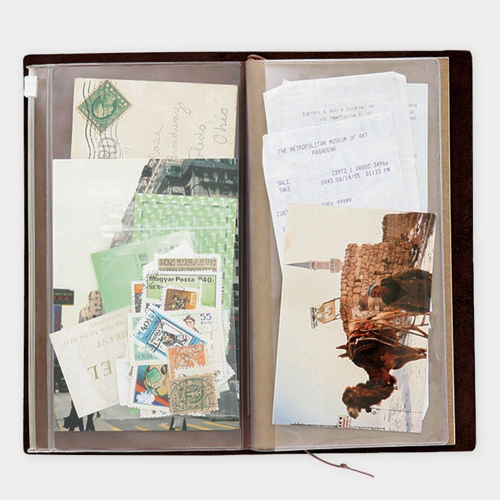 By utilizing this refill, TRAVELER’S notebook will go beyond its function as a notebook. One end has a zipper case, and another end has a pocket. In the zipper case, you can store tickets, receipts, keys, and coins. In the other end, you can put photos and post cards you collect through your travels. The case itself is transparent, so it’s easy to tell what’s inside.