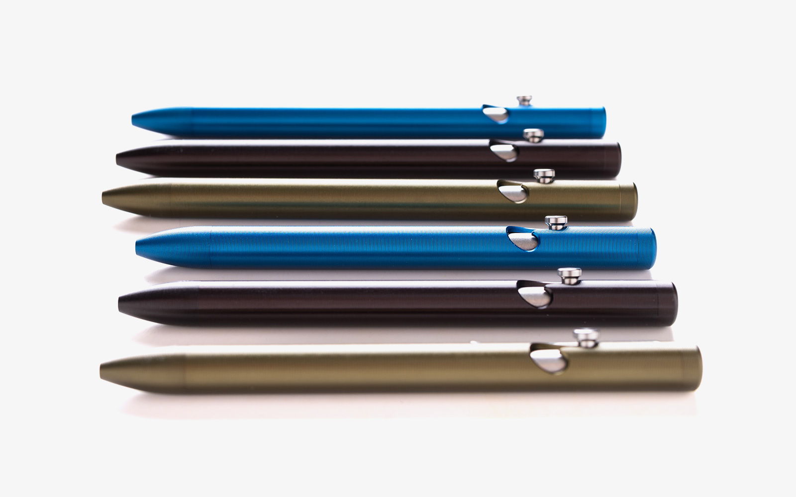 We used to offer anodized aluminum pens back in the Slider and Glider days so, when a designer asked about doing a custom run for his brand, we jumped at the opportunity to get some color samples made and they turned out amazing. Aluminum anodizes beautifully, machines quickly with minimal wear on the tooling, and is less expensive than any other material we offer. No telling if we'll keep doing runs or how long they'll be in stock but, if you want to add a cost-effective pop of color to your collection, look no further.Material