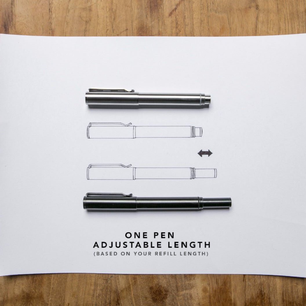 The Ti Arto EDC is our most adjustable pen yet and it accepts over 750 different refills without any hacks, mods, or annoying tip-wiggle. This pen machined from solid titanium, accepts hundreds of different refills and can be customized to be the perfect length. Making it a pen that can be passed down from one generation to the next.