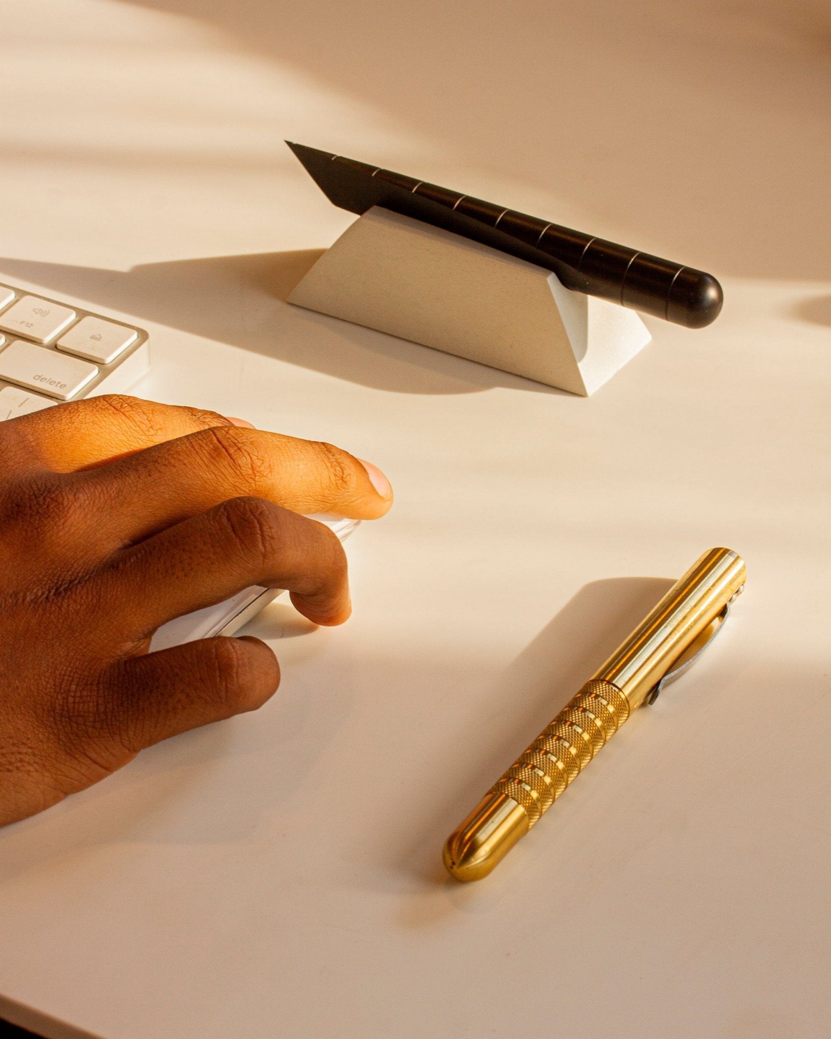 A multipurpose cutting tool intended to live on your desk, always within reach. Inspired by the Japanese kiridashi knife, but recontextualized for the contemporary workspace, the Desk Knife is elemental and satisfying to use.