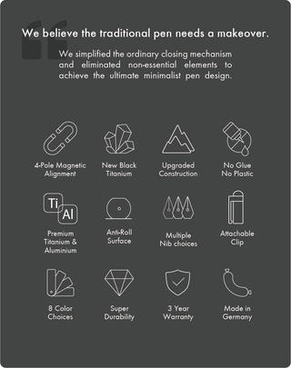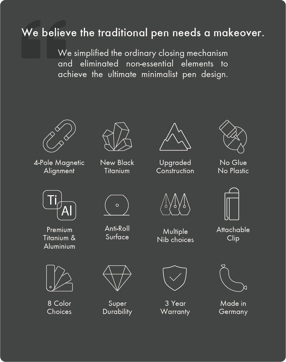 We created the most effortless and enjoyable way of getting started with a fountain pen - give the cap a simple twist and it gets automatically pushed off by a strong magnetic force. Comes in a matte-laminated premium box.