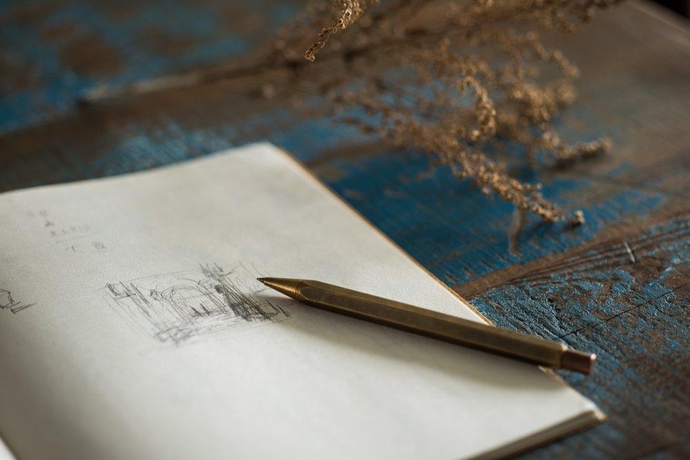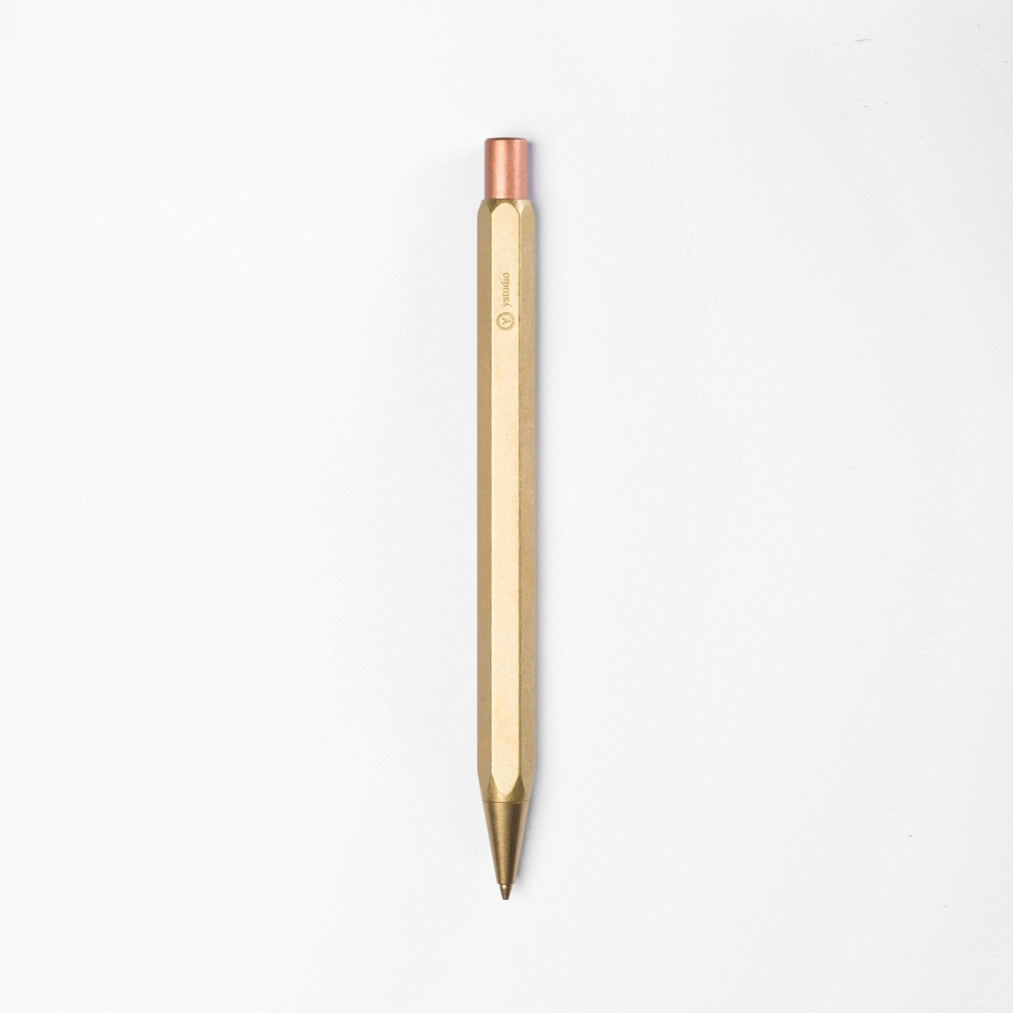 Solid brass barrel with a copper cap. The idea of hexagonal shape comes from a pencil. It provides a good balance and stability in your hands. It’s an exquisite tool when you are writing or drawing.