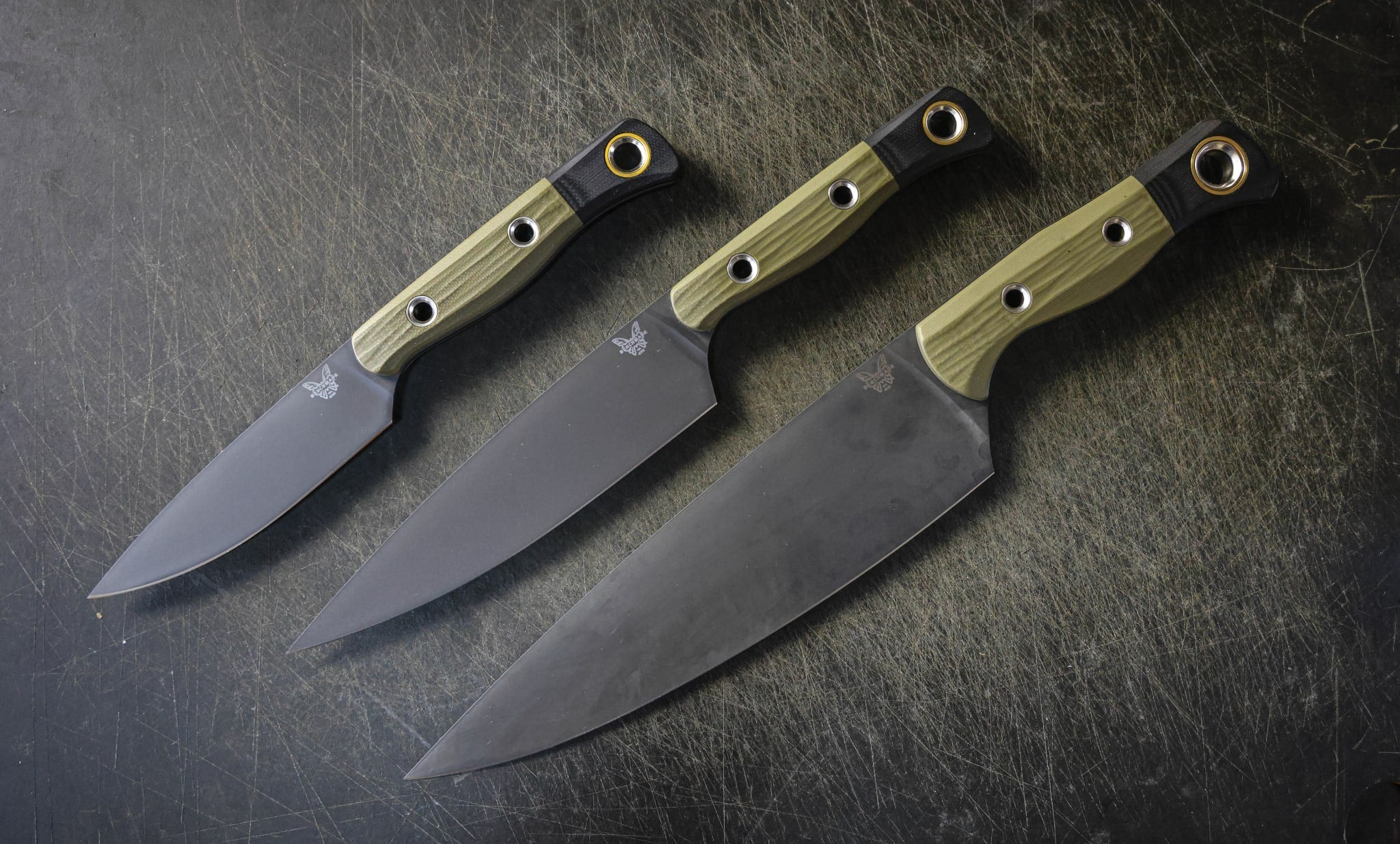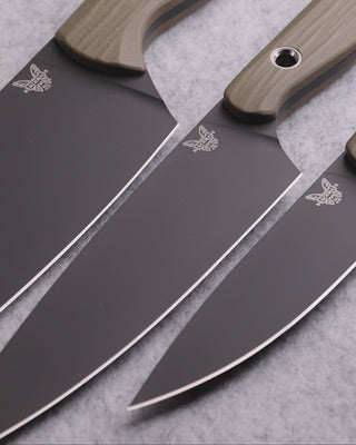The 3 Piece Set promises a precise cut, a unique aesthetic and a sharp edge thanks to Benchmade’s proprietary SelectEdge® technology. Complete with an 8” Chef Knife for thin slices of vegetables, a 6” Utility Knife with a shorter blade and small tip for trimming, and a 4” Paring Knife used for cutting and peeling fruits and veggies, and trimming excess fat with ease.