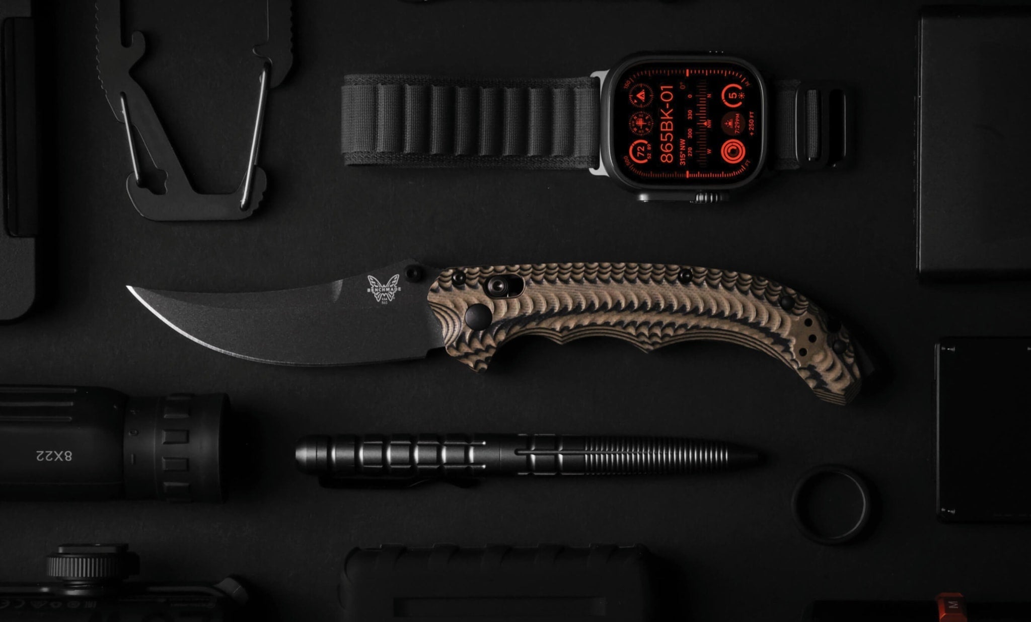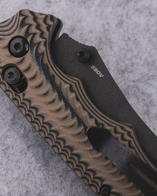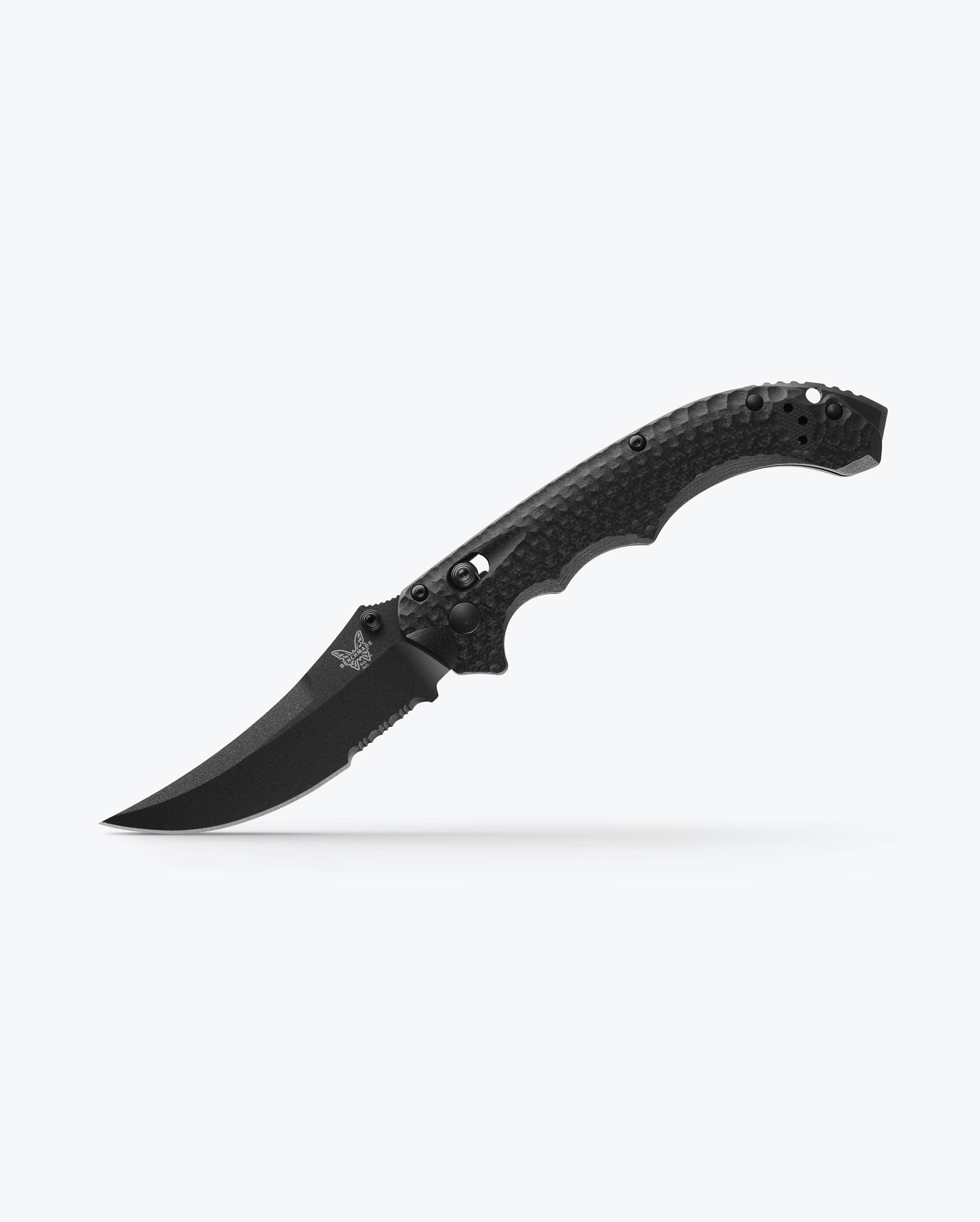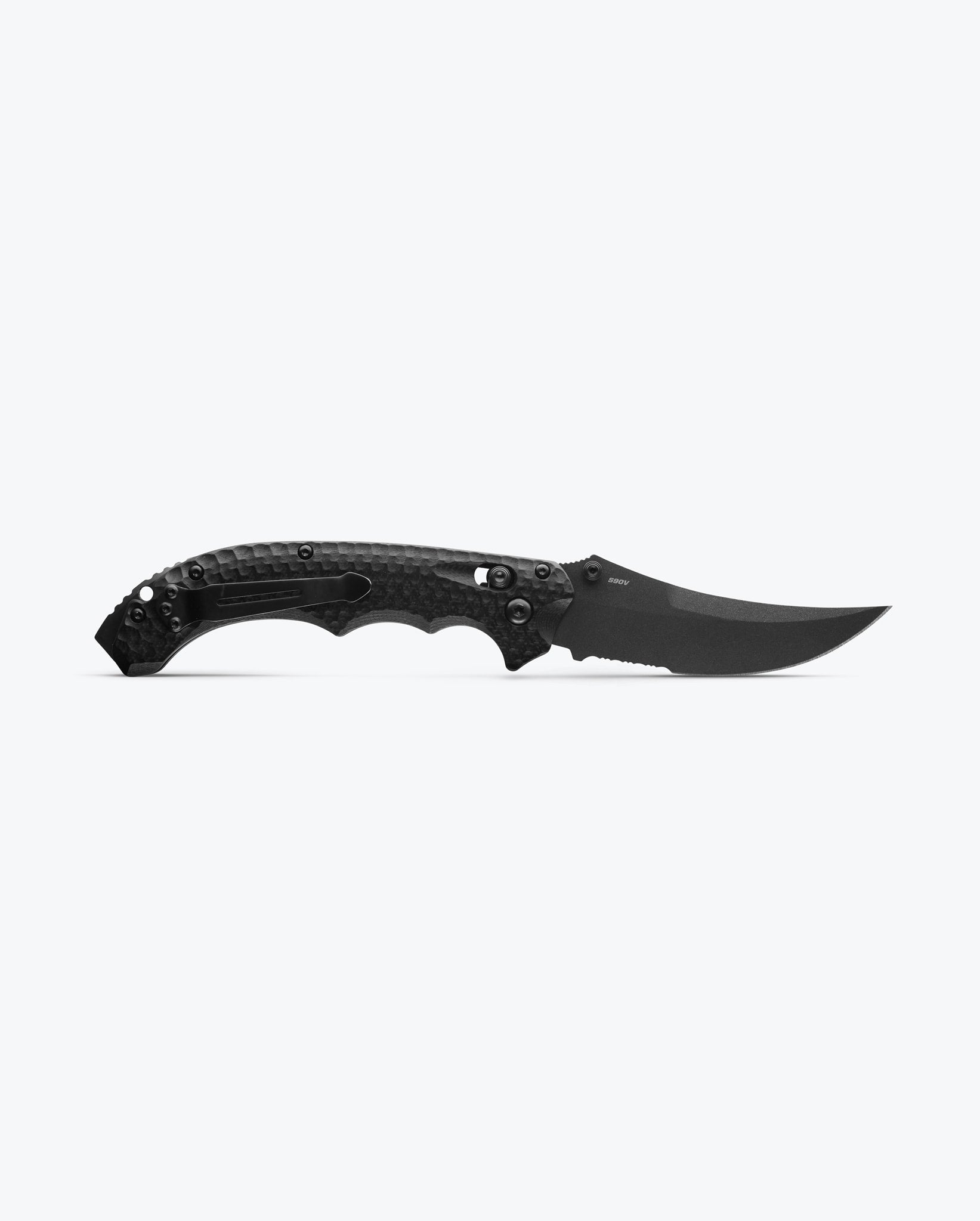 Tactical ferocity meets stylized refinement with a new EDC-friendly size in the wicked 865-02 Mini Bedlam®. Decked out in premium materials and finishes, the CPM-S90V super stainless steel blade with a satin finish gets to the point with an upswept scimitar shape ideal for hooking and slicing. The handle is crafted with marbled carbon fiber and features aggressive textures that flow with the curvature of the handle for a superior grip through quick movements and bigger cutting tasks. The 865-02 Mini Bedlam® is finished with black oxide and dark copper PVD hardware and a chamfered copper PVD backspacer to complete its unpredictable reptilian vibe.