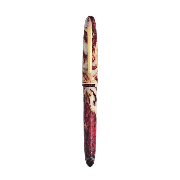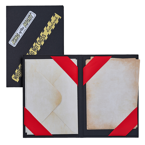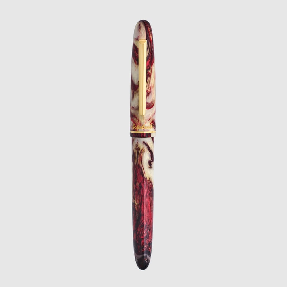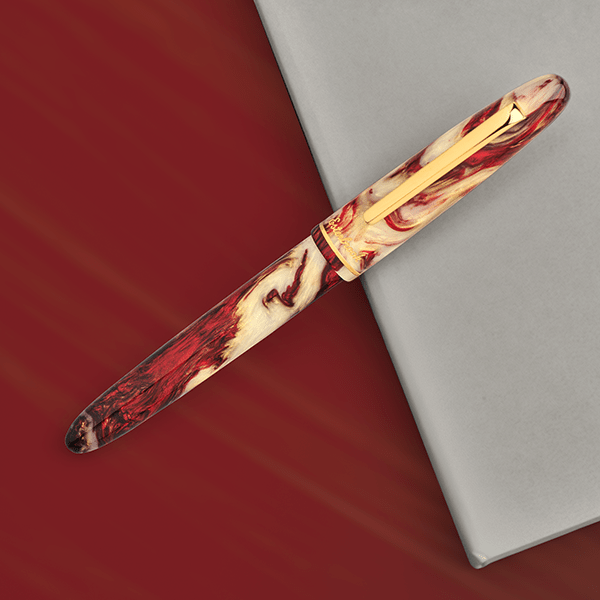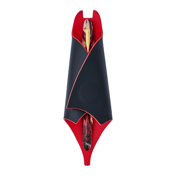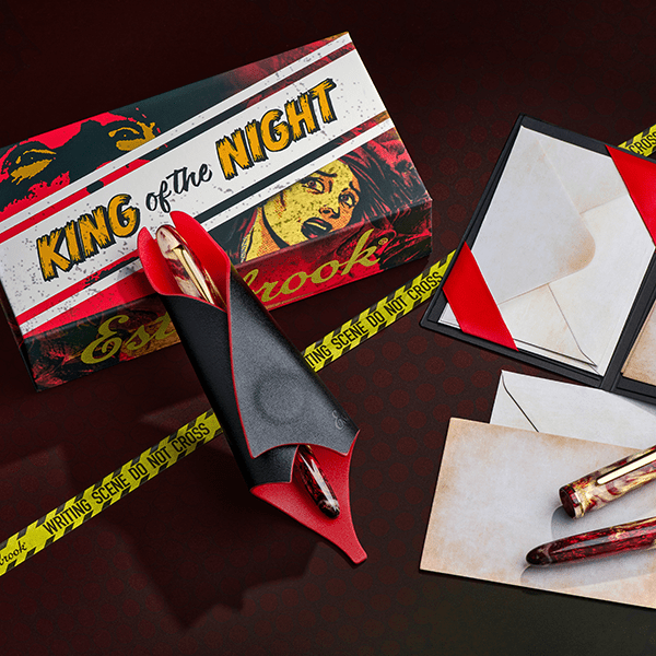 Esterbrook's King of the Night Estie captures the spirit of 1950s horror pop art. Crafted from deep red alumilite with gold and ivory shimmer, this limited-edition pen comes encased in a leatherette case inspired by vampire garb. Its glow-in-the-dark packaging, vintage-themed stationery, and Jowo German gold-plated nib make it a must-have for collectors and horror fans alike.