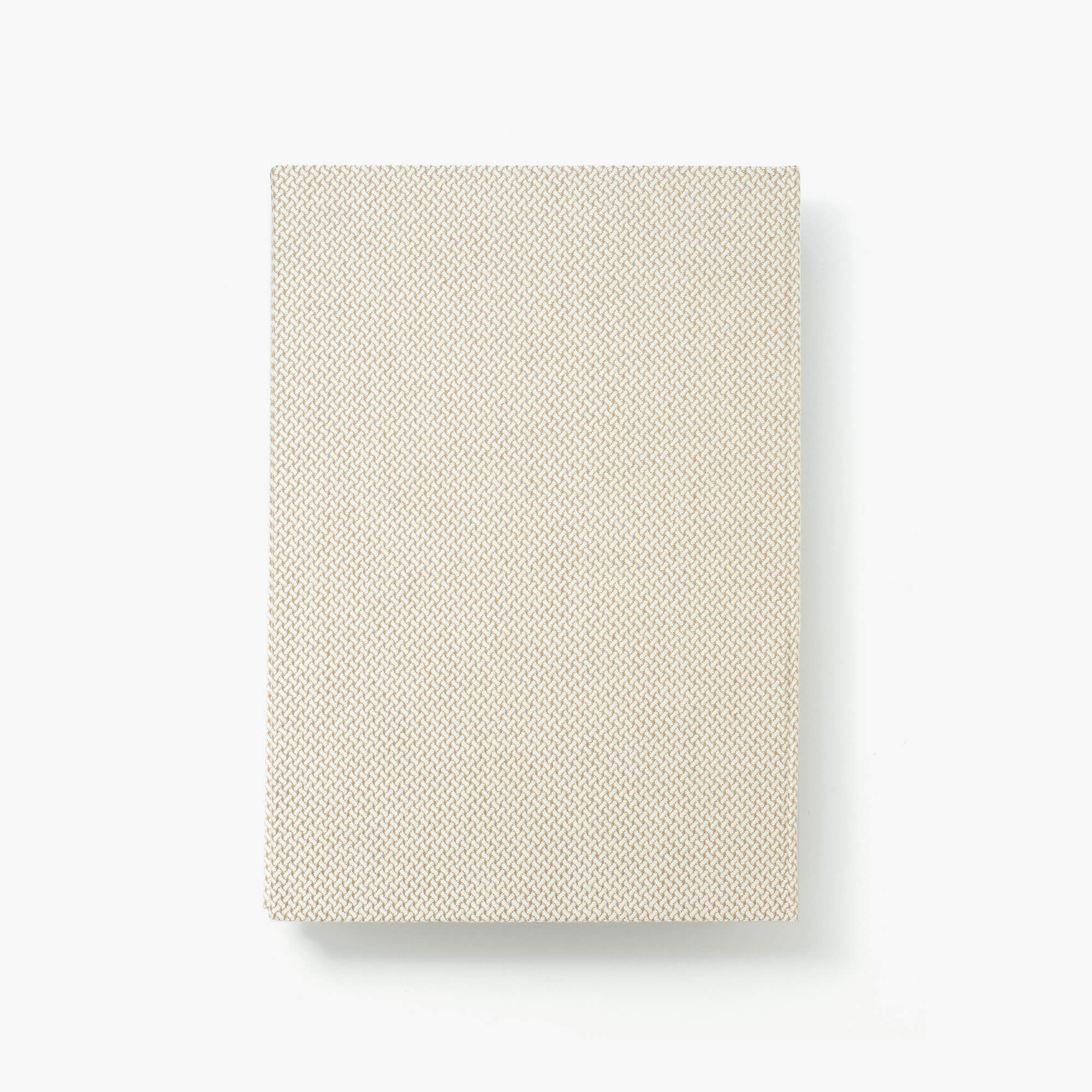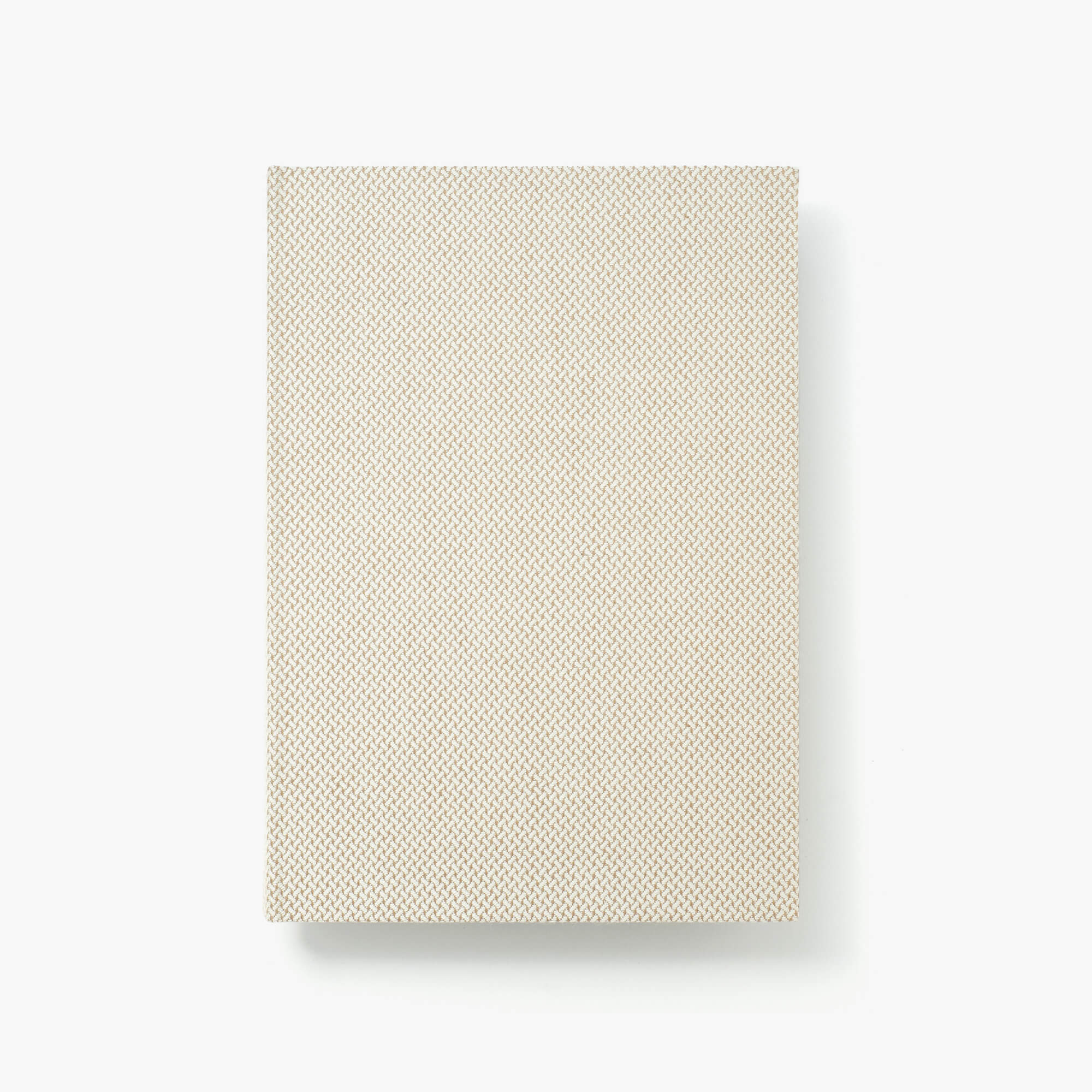 The notebook features a tactile garment fabric by Shimada Textiles, a manufacturer of Banshu-ori textiles. Banshu-ori is a regional woven textile made using the sakizome technique in which yarns are dyed before weaving. The company creates original fabric designs with skilled artisans across all stages of production.