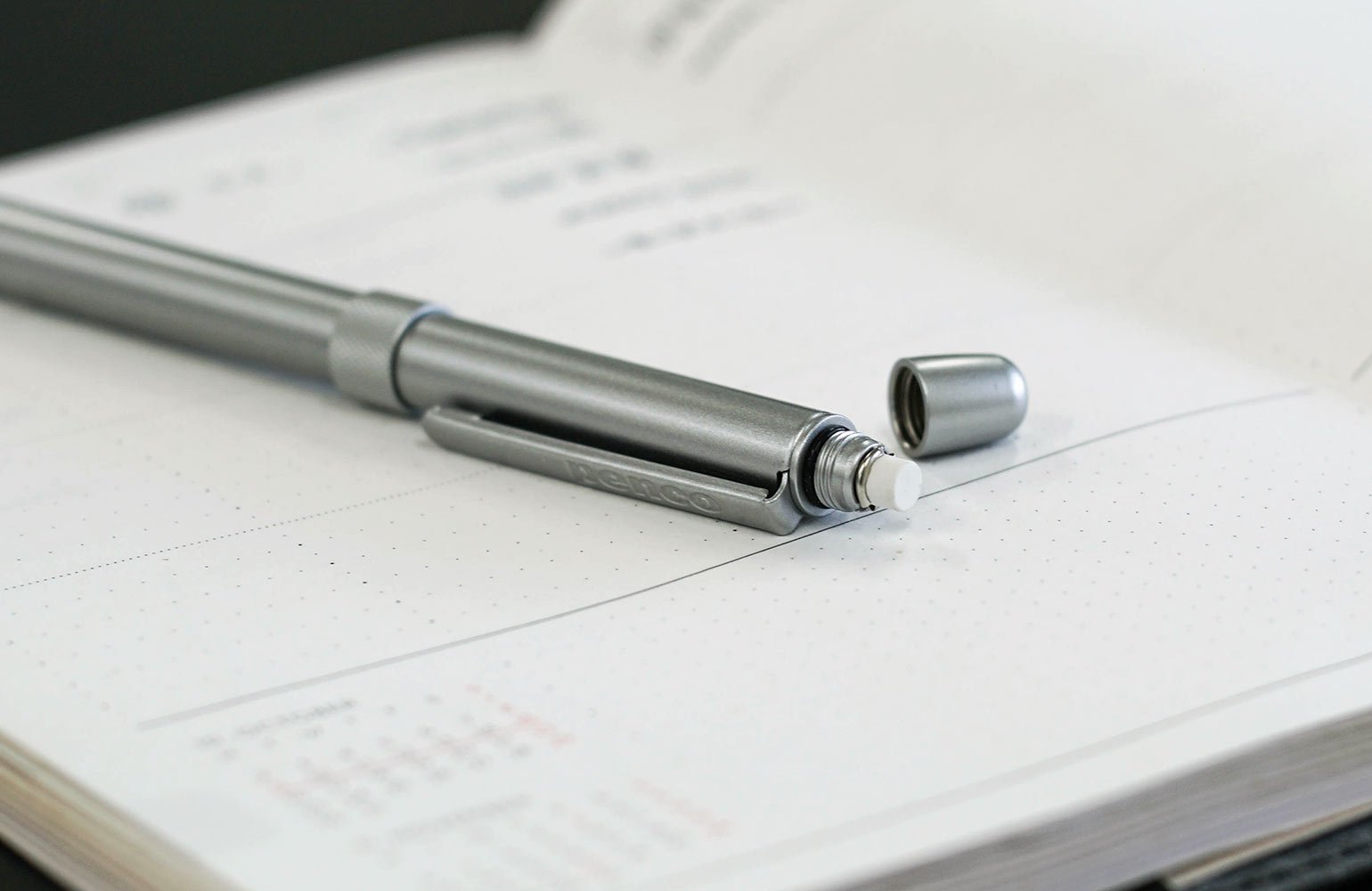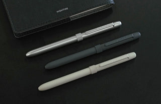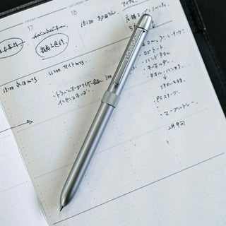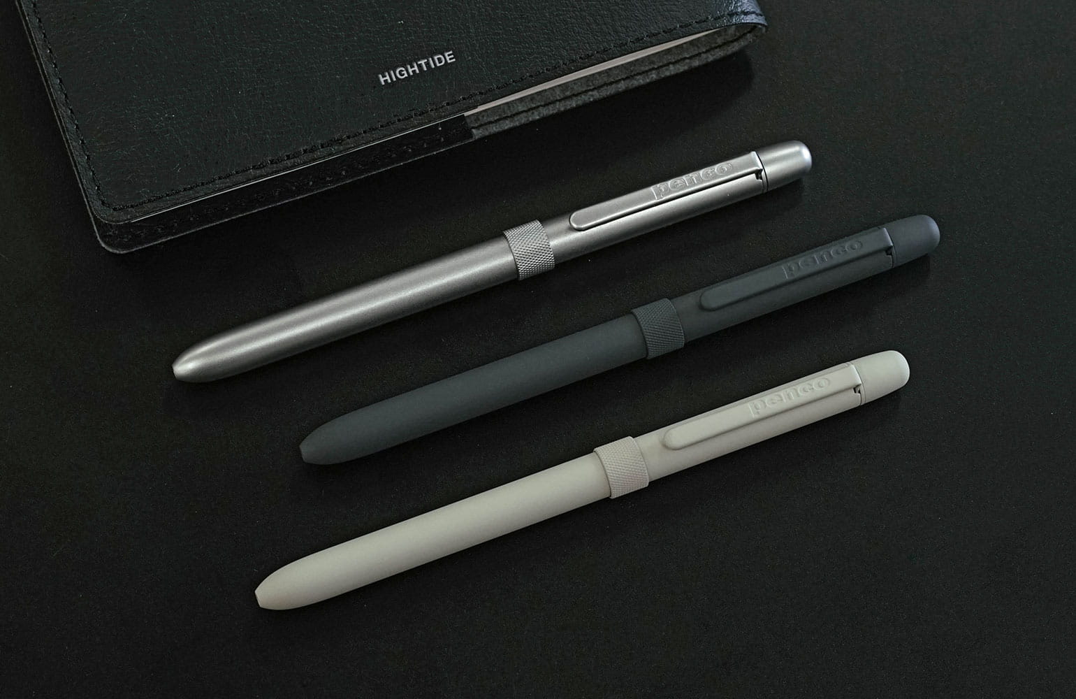 Knurled slim brass body in mat color is just right weighted. Black and red ink, pencil and eraser.