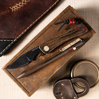 Depending on which end of the plank you're on, there's a certain allure about being a pirate. Something about the sense of adventure from setting sail across the open sea in search of treasure, free from taxation but always in peril. The Buccaneer is our attempt to capture that childlike excitement without the shipwrecks, maroonings, and well, all the plundering and other bad stuff. The Buccaneer Bexar sports custom wood grain Cerakote flat scales with deep-engraved anchors, red screws and titanium lanyard bead, cream-colored pivot, and distressed DLC bottle opener MagnaCut blade.