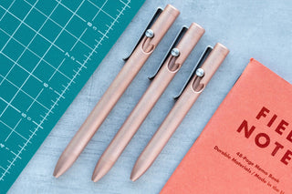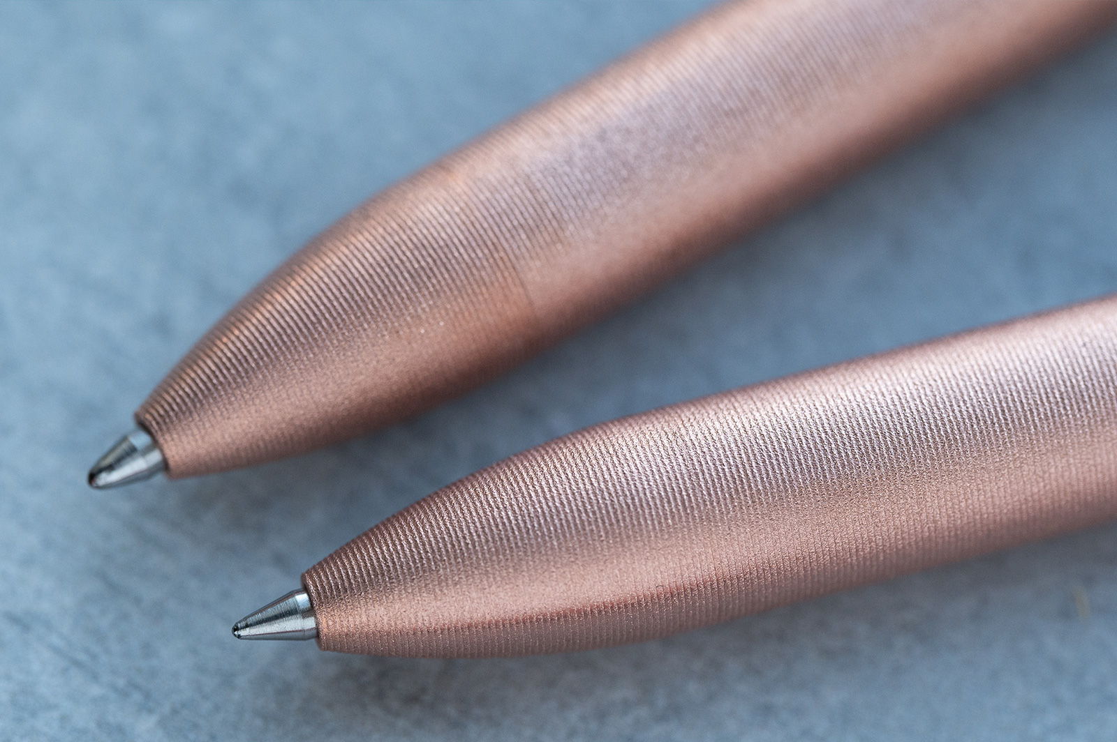 Starting with a Copper Bolt Action, each pen is bead blasted to expose the raw surface making it have a completely different feel from our traditional copper. Unlike past bead blasted offerings, we used Zirblast® ceramic beads for the first time which will gives the same look and feel but drastically slows the patina process as it doesn't open up the pores for oxidation.
